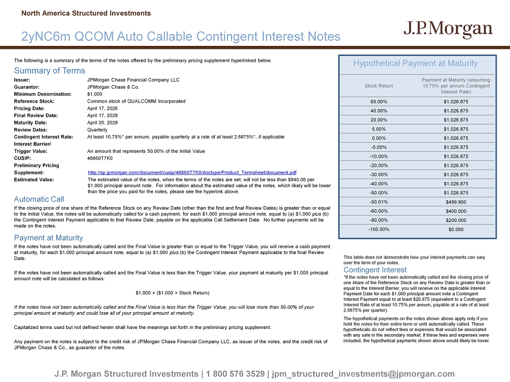 The following is a summary of the terms of the notes offered by the preliminary pricing supplement hyperlinked below. Summary of Terms Issuer: JPMorgan Chase Financial Company LLC Guarantor: JPMorgan Chase & Co. Minimum Denomination: $1,000 Reference Stock: Common stock of QUALCOMM Incorporated Pricing Date: April 17, 2026 Final Review Date: April 17, 2028 Maturity Date: April 20, 2028 Review Dates: Quarterly Contingent Interest Rate: At least 10.75%* per annum, payable quarterly at a rate of at least 2.6875%*, if applicable Interest Barrier/ Trigger Value: An amount that represents 50.00% of the Initial Value CUSIP: 46660T7K0 Preliminary Pricing Supplement: http://sp.jpmorgan.com/document/cusip/46660T7K0/doctype/Product_Termsheet/document.pdf Estimated Value: The estimated value of the notes, when the terms of the notes are set, will not be less than $940.00 per $1,000 principal amount note. For information about the estimated value of the notes, which likely will be lower than the price you paid for the notes, please see the hyperlink above. Automatic Call If the closing price of one share of the Reference Stock on any Review Date (other than the first and final Review Dates) is gre ater than or equal to the Initial Value, the notes will be automatically called for a cash payment, for each $1,000 principal amount note, equal to (a) $1,000 plus (b) the Contingent Interest Payment applicable to that Review Date, payable on the applicable Call Settlement Date. No further p aym ents will be made on the notes. Payment at Maturity If the notes have not been automatically called and the Final Value is greater than or equal to the Trigger Value, you will r ece ive a cash payment at maturity, for each $1,000 principal amount note, equal to (a) $1,000 plus (b) the Contingent Interest Payment applicable to the final Review Date. If the notes have not been automatically called and the Final Value is less than the Trigger Value, your payment at maturity per $1,000 principal amount note will be calculated as follows: $1,000 + ($1,000 î Stock Return) If the notes have not been automatically called and the Final Value is less than the Trigger Value, you will lose more than 5 0.0 0% of your principal amount at maturity and could lose all of your principal amount at maturity. Capitalized terms used but not defined herein shall have the meanings set forth in the preliminary pricing supplement. Any payment on the notes is subject to the credit risk of JPMorgan Chase Financial Company LLC, as issuer of the notes, and t he credit risk of JPMorgan Chase & Co., as guarantor of the notes. Hypothetical Payment at Maturity J.P. Morgan Structured Investments | 1 800 576 3529 | jpm_structured_inv e stments@jpmorgan.com 2yNC6m QCOM Auto Callable Contingent Interest Notes North America Structured Investments Payment at Maturity (assuming 10.75% per annum Contingent Interest Rate) Stock Return $1,026.875 6 0.00 % $1,026.875 40.00% $1,026.875 20.00% $1,026.875 5.00% $1,026.875 0.00% $1,026.875 - 5.00% $1,026.875 - 10.00% $1,026.875 - 20.00% $1,026.875 - 30.00% $1,026.875 - 40.00% $1,026.875 - 50.00% $499.900 - 50.01% $400.000 - 60.00% $200.000 - 80.00% $0.000 - 100.00% This table does not demonstrate how your interest payments can vary over the term of your notes. Contingent Interest *If the notes have not been automatically called and the closing price of one share of the Reference Stock on any Review Date is greater than or equal to the Interest Barrier, you will receive on the applicable Interest Payment Date for each $1,000 principal amount note a Contingent Interest Payment equal to at least $26.875 (equivalent to a Contingent Interest Rate of at least 10.75% per annum, payable at a rate of at least 2.6875% per quarter). The hypothetical payments on the notes shown above apply only if you hold the notes for their entire term or until automatically called. These hypotheticals do not reflect fees or expenses that would be associated with any sale in the secondary market. If these fees and expenses were included, the hypothetical payments shown above would likely be lower.