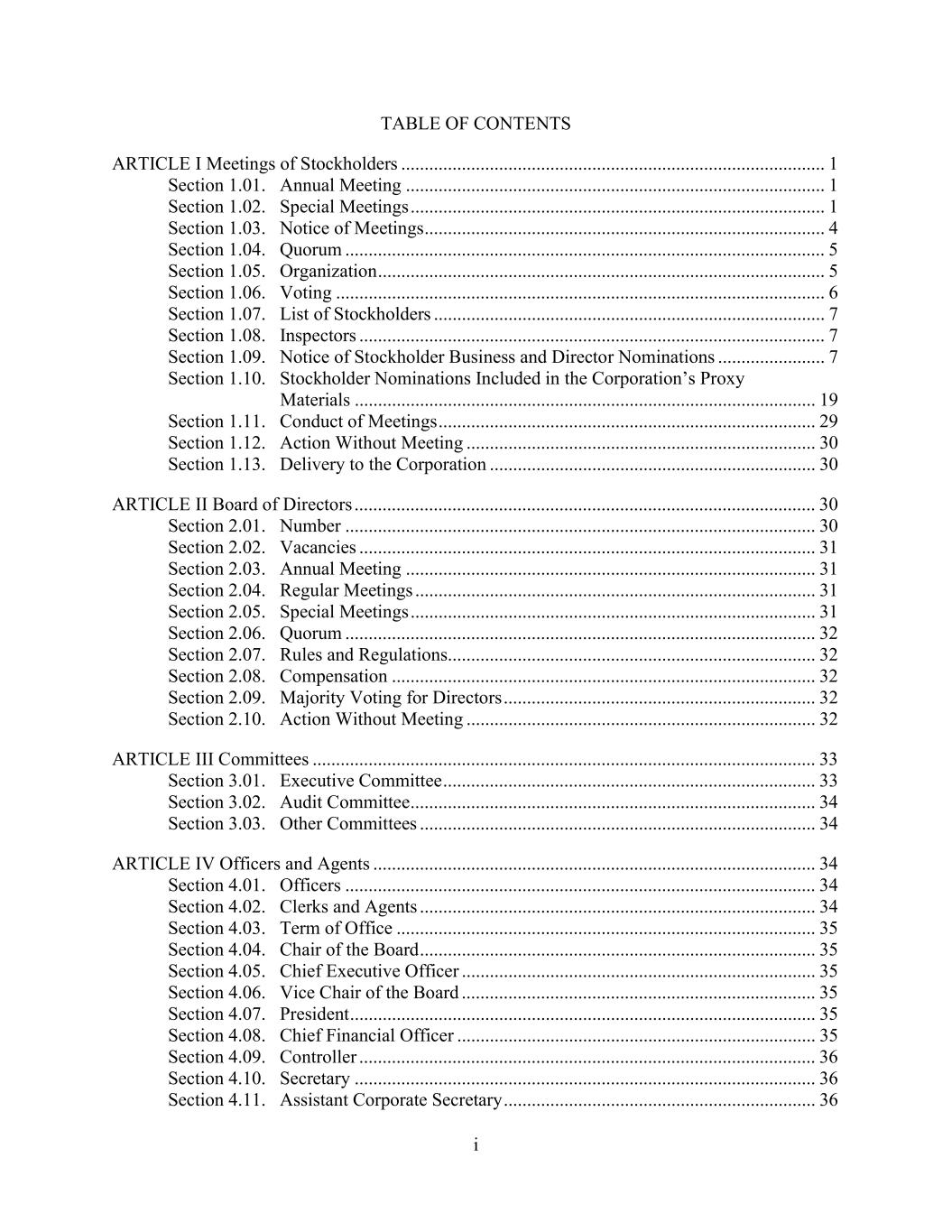 i TABLE OF CONTENTS ARTICLE I Meetings of Stockholders ........................................................................................... 1 Section 1.01. Annual Meeting .......................................................................................... 1 Section 1.02. Special Meetings ......................................................................................... 1 Section 1.03. Notice of Meetings ...................................................................................... 4 Section 1.04. Quorum ....................................................................................................... 5 Section 1.05. Organization ................................................................................................ 5 Section 1.06. Voting ......................................................................................................... 6 Section 1.07. List of Stockholders .................................................................................... 7 Section 1.08. Inspectors .................................................................................................... 7 Section 1.09. Notice of Stockholder Business and Director Nominations ....................... 7 Section 1.10. Stockholder Nominations Included in the Corporation’s Proxy Materials ................................................................................................... 19 Section 1.11. Conduct of Meetings ................................................................................. 29 Section 1.12. Action Without Meeting ........................................................................... 30 Section 1.13. Delivery to the Corporation ...................................................................... 30 ARTICLE II Board of Directors ................................................................................................... 30 Section 2.01. Number ..................................................................................................... 30 Section 2.02. Vacancies .................................................................................................. 31 Section 2.03. Annual Meeting ........................................................................................ 31 Section 2.04. Regular Meetings ...................................................................................... 31 Section 2.05. Special Meetings ....................................................................................... 31 Section 2.06. Quorum ..................................................................................................... 32 Section 2.07. Rules and Regulations............................................................................... 32 Section 2.08. Compensation ........................................................................................... 32 Section 2.09. Majority Voting for Directors ................................................................... 32 Section 2.10. Action Without Meeting ........................................................................... 32 ARTICLE III Committees ............................................................................................................ 33 Section 3.01. Executive Committee ................................................................................ 33 Section 3.02. Audit Committee ....................................................................................... 34 Section 3.03. Other Committees ..................................................................................... 34 ARTICLE IV Officers and Agents ............................................................................................... 34 Section 4.01. Officers ..................................................................................................... 34 Section 4.02. Clerks and Agents ..................................................................................... 34 Section 4.03. Term of Office .......................................................................................... 35 Section 4.04. Chair of the Board ..................................................................................... 35 Section 4.05. Chief Executive Officer ............................................................................ 35 Section 4.06. Vice Chair of the Board ............................................................................ 35 Section 4.07. President .................................................................................................... 35 Section 4.08. Chief Financial Officer ............................................................................. 35 Section 4.09. Controller .................................................................................................. 36 Section 4.10. Secretary ................................................................................................... 36 Section 4.11. Assistant Corporate Secretary ................................................................... 36