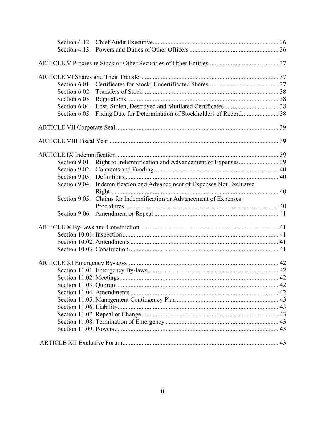 ii Section 4.12. Chief Audit Executive............................................................................... 36 Section 4.13. Powers and Duties of Other Officers ........................................................ 36 ARTICLE V Proxies re Stock or Other Securities of Other Entities ............................................ 37 ARTICLE VI Shares and Their Transfer ...................................................................................... 37 Section 6.01. Certificates for Stock; Uncertificated Shares ............................................ 37 Section 6.02. Transfers of Stock ..................................................................................... 38 Section 6.03. Regulations ............................................................................................... 38 Section 6.04. Lost, Stolen, Destroyed and Mutilated Certificates .................................. 38 Section 6.05. Fixing Date for Determination of Stockholders of Record ....................... 38 ARTICLE VII Corporate Seal ...................................................................................................... 39 ARTICLE VIII Fiscal Year .......................................................................................................... 39 ARTICLE IX Indemnification ...................................................................................................... 39 Section 9.01. Right to Indemnification and Advancement of Expenses......................... 39 Section 9.02. Contracts and Funding .............................................................................. 40 Section 9.03. Definitions................................................................................................. 40 Section 9.04. Indemnification and Advancement of Expenses Not Exclusive Right .......................................................................................................... 40 Section 9.05. Claims for Indemnification or Advancement of Expenses; Procedures ................................................................................................. 40 Section 9.06. Amendment or Repeal .............................................................................. 41 ARTICLE X By-laws and Construction ....................................................................................... 41 Section 10.01. Inspection .................................................................................................. 41 Section 10.02. Amendments ............................................................................................. 41 Section 10.03. Construction .............................................................................................. 41 ARTICLE XI Emergency By-laws ............................................................................................... 42 Section 11.01. Emergency By-laws .................................................................................. 42 Section 11.02. Meetings .................................................................................................... 42 Section 11.03. Quorum ..................................................................................................... 42 Section 11.04. Amendments ............................................................................................. 42 Section 11.05. Management Contingency Plan ................................................................ 43 Section 11.06. Liability ..................................................................................................... 43 Section 11.07. Repeal or Change ...................................................................................... 43 Section 11.08. Termination of Emergency ....................................................................... 43 Section 11.09. Powers ....................................................................................................... 43 ARTICLE XII Exclusive Forum .................................................................................................. 43