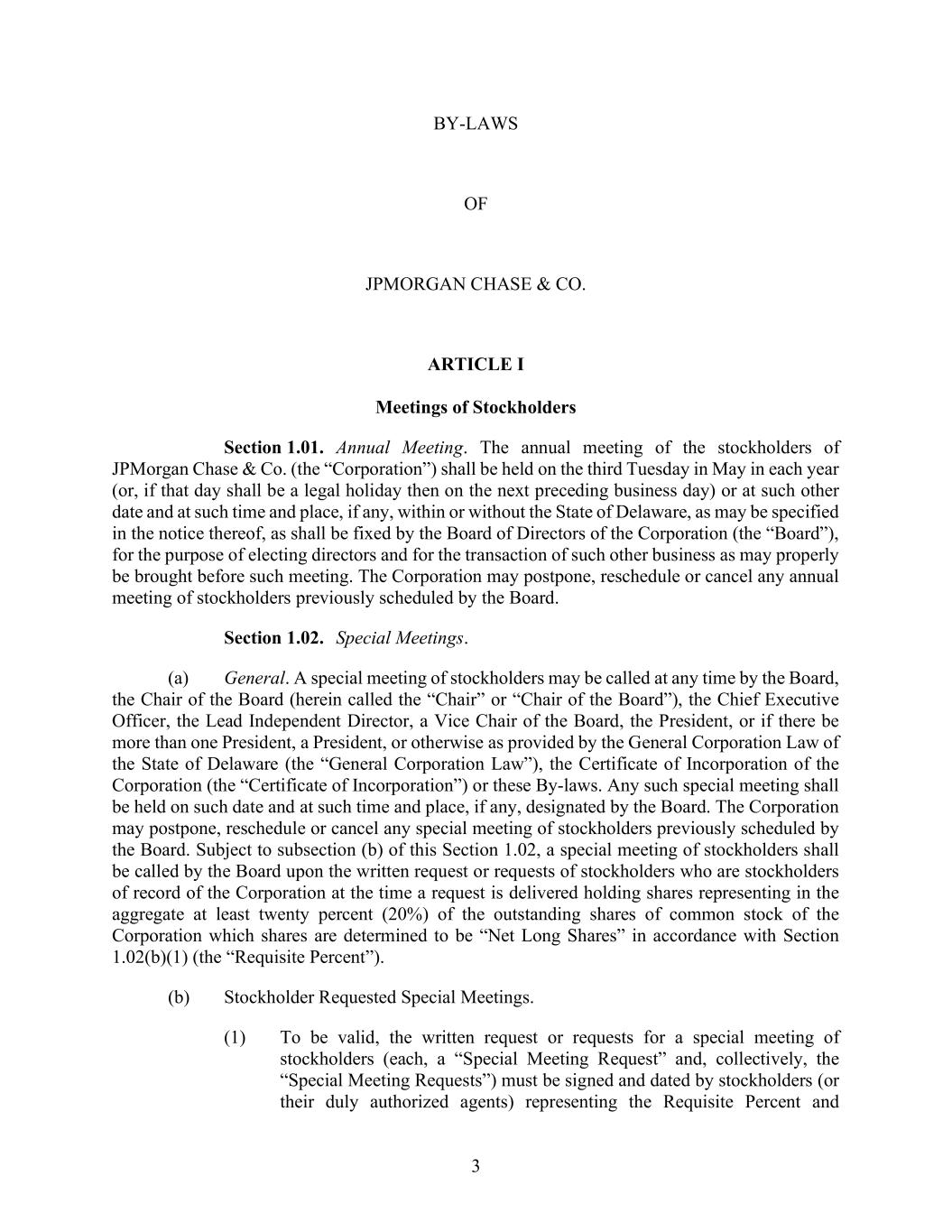 3 BY-LAWS OF JPMORGAN CHASE & CO. ARTICLE I Meetings of Stockholders Section 1.01. Annual Meeting. The annual meeting of the stockholders of JPMorgan Chase & Co. (the “Corporation”) shall be held on the third Tuesday in May in each year (or, if that day shall be a legal holiday then on the next preceding business day) or at such other date and at such time and place, if any, within or without the State of Delaware, as may be specified in the notice thereof, as shall be fixed by the Board of Directors of the Corporation (the “Board”), for the purpose of electing directors and for the transaction of such other business as may properly be brought before such meeting. The Corporation may postpone, reschedule or cancel any annual meeting of stockholders previously scheduled by the Board. Section 1.02. Special Meetings. (a) General. A special meeting of stockholders may be called at any time by the Board, the Chair of the Board (herein called the “Chair” or “Chair of the Board”), the Chief Executive Officer, the Lead Independent Director, a Vice Chair of the Board, the President, or if there be more than one President, a President, or otherwise as provided by the General Corporation Law of the State of Delaware (the “General Corporation Law”), the Certificate of Incorporation of the Corporation (the “Certificate of Incorporation”) or these By-laws. Any such special meeting shall be held on such date and at such time and place, if any, designated by the Board. The Corporation may postpone, reschedule or cancel any special meeting of stockholders previously scheduled by the Board. Subject to subsection (b) of this Section 1.02, a special meeting of stockholders shall be called by the Board upon the written request or requests of stockholders who are stockholders of record of the Corporation at the time a request is delivered holding shares representing in the aggregate at least twenty percent (20%) of the outstanding shares of common stock of the Corporation which shares are determined to be “Net Long Shares” in accordance with Section 1.02(b)(1) (the “Requisite Percent”). (b) Stockholder Requested Special Meetings. (1) To be valid, the written request or requests for a special meeting of stockholders (each, a “Special Meeting Request” and, collectively, the “Special Meeting Requests”) must be signed and dated by stockholders (or their duly authorized agents) representing the Requisite Percent and
