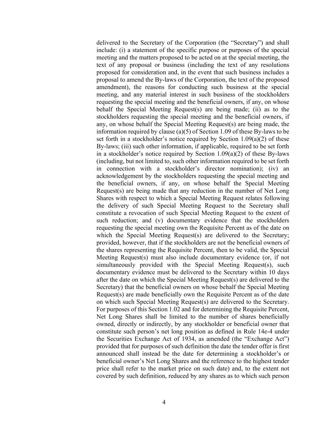4 delivered to the Secretary of the Corporation (the “Secretary”) and shall include: (i) a statement of the specific purpose or purposes of the special meeting and the matters proposed to be acted on at the special meeting, the text of any proposal or business (including the text of any resolutions proposed for consideration and, in the event that such business includes a proposal to amend the By-laws of the Corporation, the text of the proposed amendment), the reasons for conducting such business at the special meeting, and any material interest in such business of the stockholders requesting the special meeting and the beneficial owners, if any, on whose behalf the Special Meeting Request(s) are being made; (ii) as to the stockholders requesting the special meeting and the beneficial owners, if any, on whose behalf the Special Meeting Request(s) are being made, the information required by clause (a)(5) of Section 1.09 of these By-laws to be set forth in a stockholder’s notice required by Section 1.09(a)(2) of these By-laws; (iii) such other information, if applicable, required to be set forth in a stockholder’s notice required by Section 1.09(a)(2) of these By-laws (including, but not limited to, such other information required to be set forth in connection with a stockholder’s director nomination); (iv) an acknowledgement by the stockholders requesting the special meeting and the beneficial owners, if any, on whose behalf the Special Meeting Request(s) are being made that any reduction in the number of Net Long Shares with respect to which a Special Meeting Request relates following the delivery of such Special Meeting Request to the Secretary shall constitute a revocation of such Special Meeting Request to the extent of such reduction; and (v) documentary evidence that the stockholders requesting the special meeting own the Requisite Percent as of the date on which the Special Meeting Request(s) are delivered to the Secretary; provided, however, that if the stockholders are not the beneficial owners of the shares representing the Requisite Percent, then to be valid, the Special Meeting Request(s) must also include documentary evidence (or, if not simultaneously provided with the Special Meeting Request(s), such documentary evidence must be delivered to the Secretary within 10 days after the date on which the Special Meeting Request(s) are delivered to the Secretary) that the beneficial owners on whose behalf the Special Meeting Request(s) are made beneficially own the Requisite Percent as of the date on which such Special Meeting Request(s) are delivered to the Secretary. For purposes of this Section 1.02 and for determining the Requisite Percent, Net Long Shares shall be limited to the number of shares beneficially owned, directly or indirectly, by any stockholder or beneficial owner that constitute such person’s net long position as defined in Rule 14e-4 under the Securities Exchange Act of 1934, as amended (the “Exchange Act”) provided that for purposes of such definition the date the tender offer is first announced shall instead be the date for determining a stockholder’s or beneficial owner’s Net Long Shares and the reference to the highest tender price shall refer to the market price on such date) and, to the extent not covered by such definition, reduced by any shares as to which such person