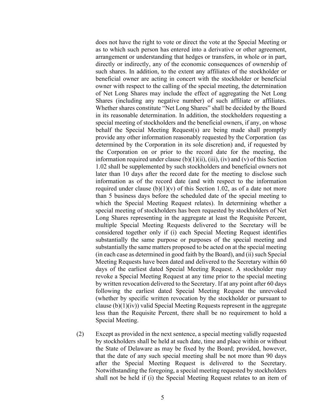5 does not have the right to vote or direct the vote at the Special Meeting or as to which such person has entered into a derivative or other agreement, arrangement or understanding that hedges or transfers, in whole or in part, directly or indirectly, any of the economic consequences of ownership of such shares. In addition, to the extent any affiliates of the stockholder or beneficial owner are acting in concert with the stockholder or beneficial owner with respect to the calling of the special meeting, the determination of Net Long Shares may include the effect of aggregating the Net Long Shares (including any negative number) of such affiliate or affiliates. Whether shares constitute “Net Long Shares” shall be decided by the Board in its reasonable determination. In addition, the stockholders requesting a special meeting of stockholders and the beneficial owners, if any, on whose behalf the Special Meeting Request(s) are being made shall promptly provide any other information reasonably requested by the Corporation (as determined by the Corporation in its sole discretion) and, if requested by the Corporation on or prior to the record date for the meeting, the information required under clause (b)(1)(ii), (iii), (iv) and (v) of this Section 1.02 shall be supplemented by such stockholders and beneficial owners not later than 10 days after the record date for the meeting to disclose such information as of the record date (and with respect to the information required under clause (b)(1)(v) of this Section 1.02, as of a date not more than 5 business days before the scheduled date of the special meeting to which the Special Meeting Request relates). In determining whether a special meeting of stockholders has been requested by stockholders of Net Long Shares representing in the aggregate at least the Requisite Percent, multiple Special Meeting Requests delivered to the Secretary will be considered together only if (i) each Special Meeting Request identifies substantially the same purpose or purposes of the special meeting and substantially the same matters proposed to be acted on at the special meeting (in each case as determined in good faith by the Board), and (ii) such Special Meeting Requests have been dated and delivered to the Secretary within 60 days of the earliest dated Special Meeting Request. A stockholder may revoke a Special Meeting Request at any time prior to the special meeting by written revocation delivered to the Secretary. If at any point after 60 days following the earliest dated Special Meeting Request the unrevoked (whether by specific written revocation by the stockholder or pursuant to clause (b)(1)(iv)) valid Special Meeting Requests represent in the aggregate less than the Requisite Percent, there shall be no requirement to hold a Special Meeting. (2) Except as provided in the next sentence, a special meeting validly requested by stockholders shall be held at such date, time and place within or without the State of Delaware as may be fixed by the Board; provided, however, that the date of any such special meeting shall be not more than 90 days after the Special Meeting Request is delivered to the Secretary. Notwithstanding the foregoing, a special meeting requested by stockholders shall not be held if (i) the Special Meeting Request relates to an item of