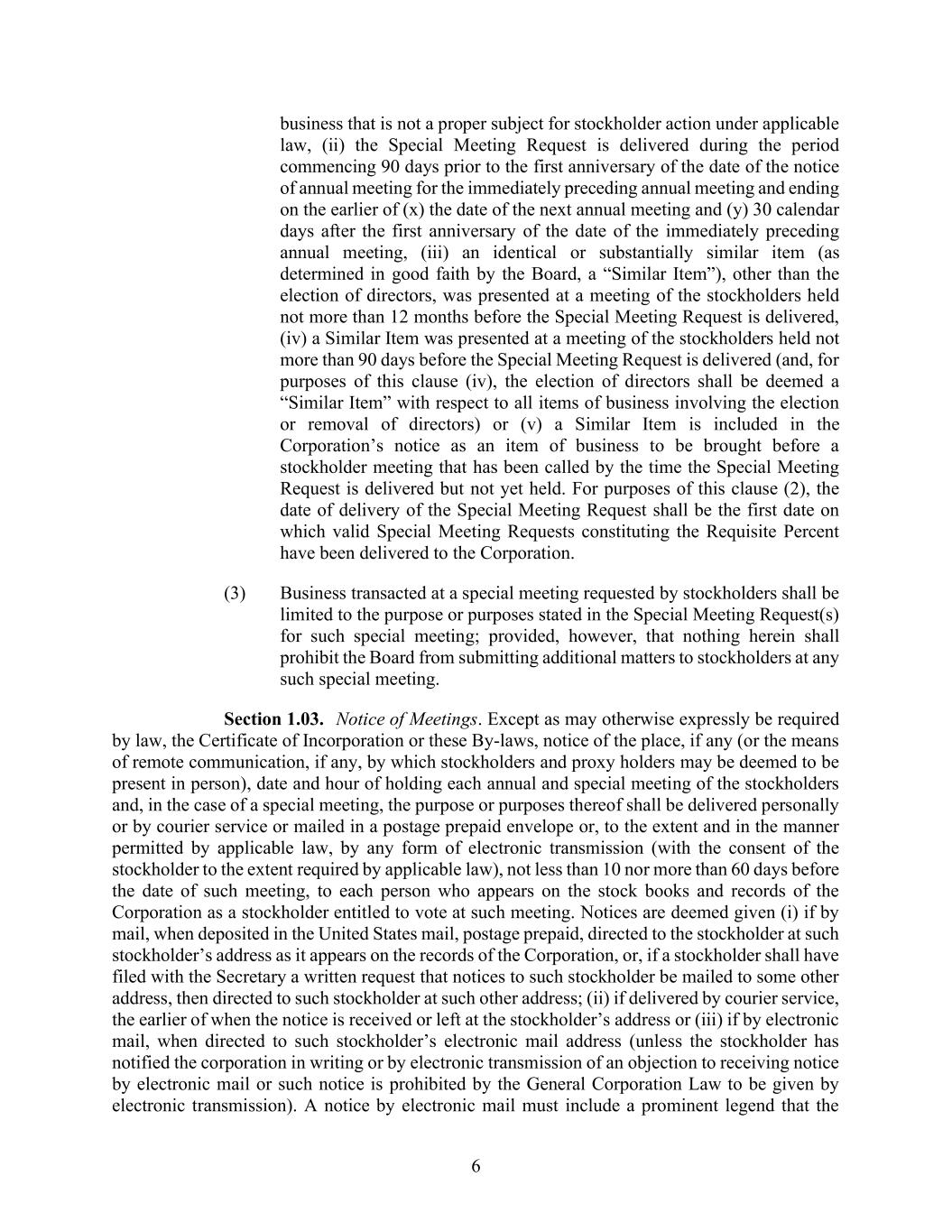 6 business that is not a proper subject for stockholder action under applicable law, (ii) the Special Meeting Request is delivered during the period commencing 90 days prior to the first anniversary of the date of the notice of annual meeting for the immediately preceding annual meeting and ending on the earlier of (x) the date of the next annual meeting and (y) 30 calendar days after the first anniversary of the date of the immediately preceding annual meeting, (iii) an identical or substantially similar item (as determined in good faith by the Board, a “Similar Item”), other than the election of directors, was presented at a meeting of the stockholders held not more than 12 months before the Special Meeting Request is delivered, (iv) a Similar Item was presented at a meeting of the stockholders held not more than 90 days before the Special Meeting Request is delivered (and, for purposes of this clause (iv), the election of directors shall be deemed a “Similar Item” with respect to all items of business involving the election or removal of directors) or (v) a Similar Item is included in the Corporation’s notice as an item of business to be brought before a stockholder meeting that has been called by the time the Special Meeting Request is delivered but not yet held. For purposes of this clause (2), the date of delivery of the Special Meeting Request shall be the first date on which valid Special Meeting Requests constituting the Requisite Percent have been delivered to the Corporation. (3) Business transacted at a special meeting requested by stockholders shall be limited to the purpose or purposes stated in the Special Meeting Request(s) for such special meeting; provided, however, that nothing herein shall prohibit the Board from submitting additional matters to stockholders at any such special meeting. Section 1.03. Notice of Meetings. Except as may otherwise expressly be required by law, the Certificate of Incorporation or these By-laws, notice of the place, if any (or the means of remote communication, if any, by which stockholders and proxy holders may be deemed to be present in person), date and hour of holding each annual and special meeting of the stockholders and, in the case of a special meeting, the purpose or purposes thereof shall be delivered personally or by courier service or mailed in a postage prepaid envelope or, to the extent and in the manner permitted by applicable law, by any form of electronic transmission (with the consent of the stockholder to the extent required by applicable law), not less than 10 nor more than 60 days before the date of such meeting, to each person who appears on the stock books and records of the Corporation as a stockholder entitled to vote at such meeting. Notices are deemed given (i) if by mail, when deposited in the United States mail, postage prepaid, directed to the stockholder at such stockholder’s address as it appears on the records of the Corporation, or, if a stockholder shall have filed with the Secretary a written request that notices to such stockholder be mailed to some other address, then directed to such stockholder at such other address; (ii) if delivered by courier service, the earlier of when the notice is received or left at the stockholder’s address or (iii) if by electronic mail, when directed to such stockholder’s electronic mail address (unless the stockholder has notified the corporation in writing or by electronic transmission of an objection to receiving notice by electronic mail or such notice is prohibited by the General Corporation Law to be given by electronic transmission). A notice by electronic mail must include a prominent legend that the