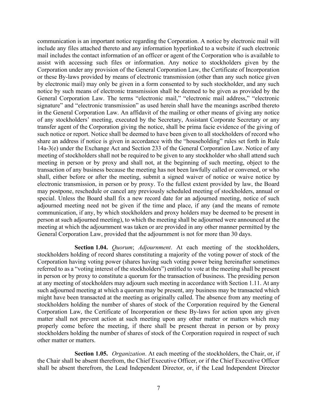 7 communication is an important notice regarding the Corporation. A notice by electronic mail will include any files attached thereto and any information hyperlinked to a website if such electronic mail includes the contact information of an officer or agent of the Corporation who is available to assist with accessing such files or information. Any notice to stockholders given by the Corporation under any provision of the General Corporation Law, the Certificate of Incorporation or these By-laws provided by means of electronic transmission (other than any such notice given by electronic mail) may only be given in a form consented to by such stockholder, and any such notice by such means of electronic transmission shall be deemed to be given as provided by the General Corporation Law. The terms “electronic mail,” “electronic mail address,” “electronic signature” and “electronic transmission” as used herein shall have the meanings ascribed thereto in the General Corporation Law. An affidavit of the mailing or other means of giving any notice of any stockholders’ meeting, executed by the Secretary, Assistant Corporate Secretary or any transfer agent of the Corporation giving the notice, shall be prima facie evidence of the giving of such notice or report. Notice shall be deemed to have been given to all stockholders of record who share an address if notice is given in accordance with the “householding” rules set forth in Rule 14a-3(e) under the Exchange Act and Section 233 of the General Corporation Law. Notice of any meeting of stockholders shall not be required to be given to any stockholder who shall attend such meeting in person or by proxy and shall not, at the beginning of such meeting, object to the transaction of any business because the meeting has not been lawfully called or convened, or who shall, either before or after the meeting, submit a signed waiver of notice or waive notice by electronic transmission, in person or by proxy. To the fullest extent provided by law, the Board may postpone, reschedule or cancel any previously scheduled meeting of stockholders, annual or special. Unless the Board shall fix a new record date for an adjourned meeting, notice of such adjourned meeting need not be given if the time and place, if any (and the means of remote communication, if any, by which stockholders and proxy holders may be deemed to be present in person at such adjourned meeting), to which the meeting shall be adjourned were announced at the meeting at which the adjournment was taken or are provided in any other manner permitted by the General Corporation Law, provided that the adjournment is not for more than 30 days. Section 1.04. Quorum; Adjournment. At each meeting of the stockholders, stockholders holding of record shares constituting a majority of the voting power of stock of the Corporation having voting power (shares having such voting power being hereinafter sometimes referred to as a “voting interest of the stockholders”) entitled to vote at the meeting shall be present in person or by proxy to constitute a quorum for the transaction of business. The presiding person at any meeting of stockholders may adjourn such meeting in accordance with Section 1.11. At any such adjourned meeting at which a quorum may be present, any business may be transacted which might have been transacted at the meeting as originally called. The absence from any meeting of stockholders holding the number of shares of stock of the Corporation required by the General Corporation Law, the Certificate of Incorporation or these By-laws for action upon any given matter shall not prevent action at such meeting upon any other matter or matters which may properly come before the meeting, if there shall be present thereat in person or by proxy stockholders holding the number of shares of stock of the Corporation required in respect of such other matter or matters. Section 1.05. Organization. At each meeting of the stockholders, the Chair, or, if the Chair shall be absent therefrom, the Chief Executive Officer, or if the Chief Executive Officer shall be absent therefrom, the Lead Independent Director, or, if the Lead Independent Director