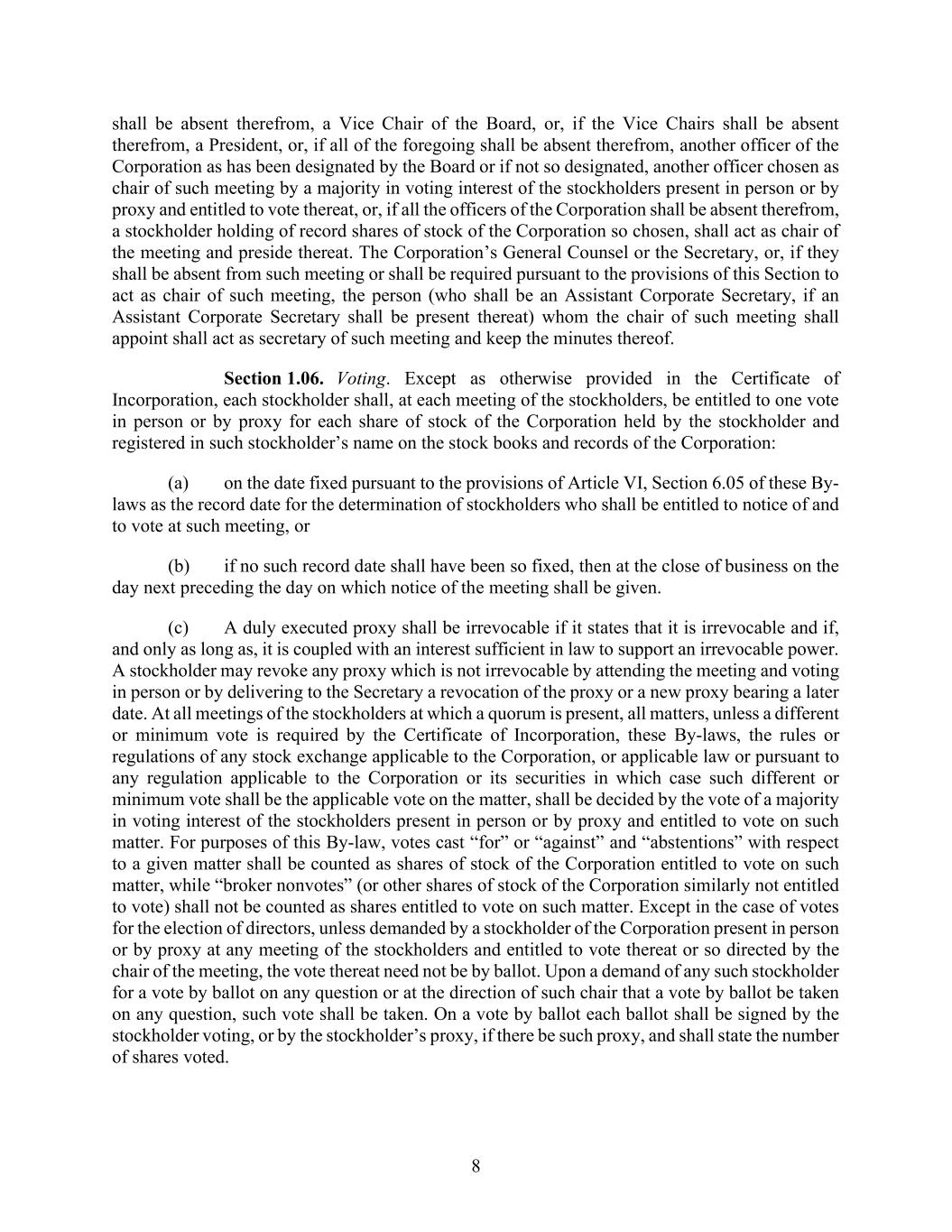 8 shall be absent therefrom, a Vice Chair of the Board, or, if the Vice Chairs shall be absent therefrom, a President, or, if all of the foregoing shall be absent therefrom, another officer of the Corporation as has been designated by the Board or if not so designated, another officer chosen as chair of such meeting by a majority in voting interest of the stockholders present in person or by proxy and entitled to vote thereat, or, if all the officers of the Corporation shall be absent therefrom, a stockholder holding of record shares of stock of the Corporation so chosen, shall act as chair of the meeting and preside thereat. The Corporation’s General Counsel or the Secretary, or, if they shall be absent from such meeting or shall be required pursuant to the provisions of this Section to act as chair of such meeting, the person (who shall be an Assistant Corporate Secretary, if an Assistant Corporate Secretary shall be present thereat) whom the chair of such meeting shall appoint shall act as secretary of such meeting and keep the minutes thereof. Section 1.06. Voting. Except as otherwise provided in the Certificate of Incorporation, each stockholder shall, at each meeting of the stockholders, be entitled to one vote in person or by proxy for each share of stock of the Corporation held by the stockholder and registered in such stockholder’s name on the stock books and records of the Corporation: (a) on the date fixed pursuant to the provisions of Article VI, Section 6.05 of these By- laws as the record date for the determination of stockholders who shall be entitled to notice of and to vote at such meeting, or (b) if no such record date shall have been so fixed, then at the close of business on the day next preceding the day on which notice of the meeting shall be given. (c) A duly executed proxy shall be irrevocable if it states that it is irrevocable and if, and only as long as, it is coupled with an interest sufficient in law to support an irrevocable power. A stockholder may revoke any proxy which is not irrevocable by attending the meeting and voting in person or by delivering to the Secretary a revocation of the proxy or a new proxy bearing a later date. At all meetings of the stockholders at which a quorum is present, all matters, unless a different or minimum vote is required by the Certificate of Incorporation, these By-laws, the rules or regulations of any stock exchange applicable to the Corporation, or applicable law or pursuant to any regulation applicable to the Corporation or its securities in which case such different or minimum vote shall be the applicable vote on the matter, shall be decided by the vote of a majority in voting interest of the stockholders present in person or by proxy and entitled to vote on such matter. For purposes of this By-law, votes cast “for” or “against” and “abstentions” with respect to a given matter shall be counted as shares of stock of the Corporation entitled to vote on such matter, while “broker nonvotes” (or other shares of stock of the Corporation similarly not entitled to vote) shall not be counted as shares entitled to vote on such matter. Except in the case of votes for the election of directors, unless demanded by a stockholder of the Corporation present in person or by proxy at any meeting of the stockholders and entitled to vote thereat or so directed by the chair of the meeting, the vote thereat need not be by ballot. Upon a demand of any such stockholder for a vote by ballot on any question or at the direction of such chair that a vote by ballot be taken on any question, such vote shall be taken. On a vote by ballot each ballot shall be signed by the stockholder voting, or by the stockholder’s proxy, if there be such proxy, and shall state the number of shares voted.