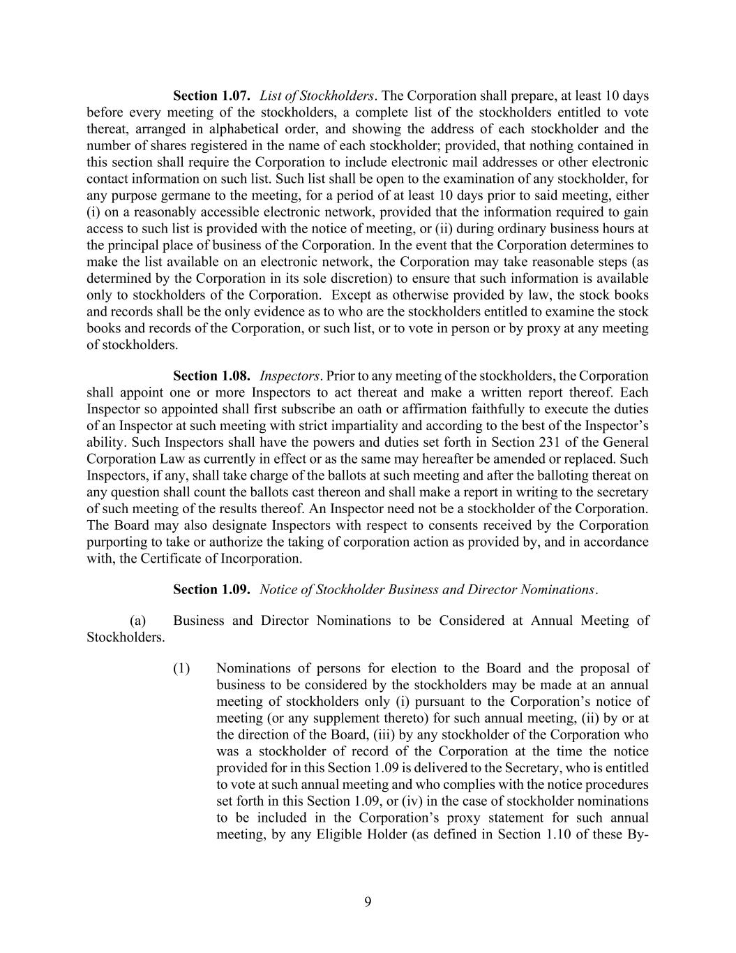 9 Section 1.07. List of Stockholders. The Corporation shall prepare, at least 10 days before every meeting of the stockholders, a complete list of the stockholders entitled to vote thereat, arranged in alphabetical order, and showing the address of each stockholder and the number of shares registered in the name of each stockholder; provided, that nothing contained in this section shall require the Corporation to include electronic mail addresses or other electronic contact information on such list. Such list shall be open to the examination of any stockholder, for any purpose germane to the meeting, for a period of at least 10 days prior to said meeting, either (i) on a reasonably accessible electronic network, provided that the information required to gain access to such list is provided with the notice of meeting, or (ii) during ordinary business hours at the principal place of business of the Corporation. In the event that the Corporation determines to make the list available on an electronic network, the Corporation may take reasonable steps (as determined by the Corporation in its sole discretion) to ensure that such information is available only to stockholders of the Corporation. Except as otherwise provided by law, the stock books and records shall be the only evidence as to who are the stockholders entitled to examine the stock books and records of the Corporation, or such list, or to vote in person or by proxy at any meeting of stockholders. Section 1.08. Inspectors. Prior to any meeting of the stockholders, the Corporation shall appoint one or more Inspectors to act thereat and make a written report thereof. Each Inspector so appointed shall first subscribe an oath or affirmation faithfully to execute the duties of an Inspector at such meeting with strict impartiality and according to the best of the Inspector’s ability. Such Inspectors shall have the powers and duties set forth in Section 231 of the General Corporation Law as currently in effect or as the same may hereafter be amended or replaced. Such Inspectors, if any, shall take charge of the ballots at such meeting and after the balloting thereat on any question shall count the ballots cast thereon and shall make a report in writing to the secretary of such meeting of the results thereof. An Inspector need not be a stockholder of the Corporation. The Board may also designate Inspectors with respect to consents received by the Corporation purporting to take or authorize the taking of corporation action as provided by, and in accordance with, the Certificate of Incorporation. Section 1.09. Notice of Stockholder Business and Director Nominations. (a) Business and Director Nominations to be Considered at Annual Meeting of Stockholders. (1) Nominations of persons for election to the Board and the proposal of business to be considered by the stockholders may be made at an annual meeting of stockholders only (i) pursuant to the Corporation’s notice of meeting (or any supplement thereto) for such annual meeting, (ii) by or at the direction of the Board, (iii) by any stockholder of the Corporation who was a stockholder of record of the Corporation at the time the notice provided for in this Section 1.09 is delivered to the Secretary, who is entitled to vote at such annual meeting and who complies with the notice procedures set forth in this Section 1.09, or (iv) in the case of stockholder nominations to be included in the Corporation’s proxy statement for such annual meeting, by any Eligible Holder (as defined in Section 1.10 of these By-