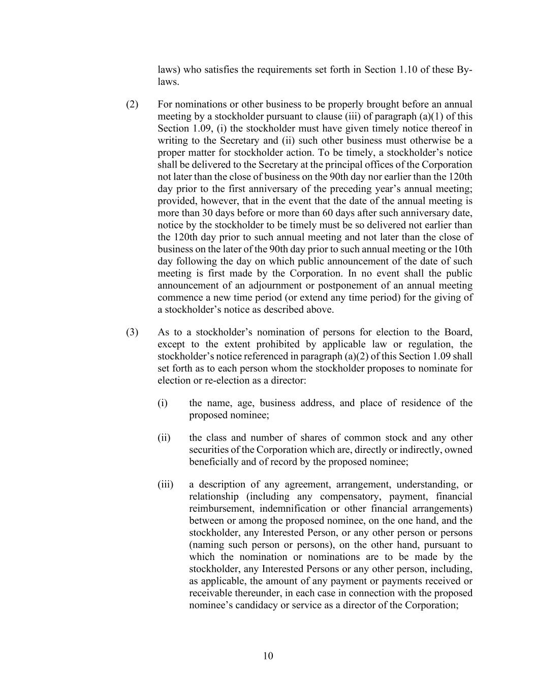 10 laws) who satisfies the requirements set forth in Section 1.10 of these By- laws. (2) For nominations or other business to be properly brought before an annual meeting by a stockholder pursuant to clause (iii) of paragraph (a)(1) of this Section 1.09, (i) the stockholder must have given timely notice thereof in writing to the Secretary and (ii) such other business must otherwise be a proper matter for stockholder action. To be timely, a stockholder’s notice shall be delivered to the Secretary at the principal offices of the Corporation not later than the close of business on the 90th day nor earlier than the 120th day prior to the first anniversary of the preceding year’s annual meeting; provided, however, that in the event that the date of the annual meeting is more than 30 days before or more than 60 days after such anniversary date, notice by the stockholder to be timely must be so delivered not earlier than the 120th day prior to such annual meeting and not later than the close of business on the later of the 90th day prior to such annual meeting or the 10th day following the day on which public announcement of the date of such meeting is first made by the Corporation. In no event shall the public announcement of an adjournment or postponement of an annual meeting commence a new time period (or extend any time period) for the giving of a stockholder’s notice as described above. (3) As to a stockholder’s nomination of persons for election to the Board, except to the extent prohibited by applicable law or regulation, the stockholder’s notice referenced in paragraph (a)(2) of this Section 1.09 shall set forth as to each person whom the stockholder proposes to nominate for election or re-election as a director: (i) the name, age, business address, and place of residence of the proposed nominee; (ii) the class and number of shares of common stock and any other securities of the Corporation which are, directly or indirectly, owned beneficially and of record by the proposed nominee; (iii) a description of any agreement, arrangement, understanding, or relationship (including any compensatory, payment, financial reimbursement, indemnification or other financial arrangements) between or among the proposed nominee, on the one hand, and the stockholder, any Interested Person, or any other person or persons (naming such person or persons), on the other hand, pursuant to which the nomination or nominations are to be made by the stockholder, any Interested Persons or any other person, including, as applicable, the amount of any payment or payments received or receivable thereunder, in each case in connection with the proposed nominee’s candidacy or service as a director of the Corporation;