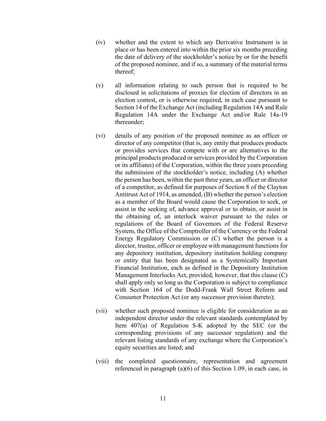 11 (iv) whether and the extent to which any Derivative Instrument is in place or has been entered into within the prior six months preceding the date of delivery of the stockholder’s notice by or for the benefit of the proposed nominee, and if so, a summary of the material terms thereof; (v) all information relating to such person that is required to be disclosed in solicitations of proxies for election of directors in an election contest, or is otherwise required, in each case pursuant to Section 14 of the Exchange Act (including Regulation 14A and Rule Regulation 14A under the Exchange Act and/or Rule 14a-19 thereunder; (vi) details of any position of the proposed nominee as an officer or director of any competitor (that is, any entity that produces products or provides services that compete with or are alternatives to the principal products produced or services provided by the Corporation or its affiliates) of the Corporation, within the three years preceding the submission of the stockholder’s notice, including (A) whether the person has been, within the past three years, an officer or director of a competitor, as defined for purposes of Section 8 of the Clayton Antitrust Act of 1914, as amended, (B) whether the person’s election as a member of the Board would cause the Corporation to seek, or assist in the seeking of, advance approval or to obtain, or assist in the obtaining of, an interlock waiver pursuant to the rules or regulations of the Board of Governors of the Federal Reserve System, the Office of the Comptroller of the Currency or the Federal Energy Regulatory Commission or (C) whether the person is a director, trustee, officer or employee with management functions for any depository institution, depository institution holding company or entity that has been designated as a Systemically Important Financial Institution, each as defined in the Depository Institution Management Interlocks Act, provided, however, that this clause (C) shall apply only so long as the Corporation is subject to compliance with Section 164 of the Dodd-Frank Wall Street Reform and Consumer Protection Act (or any successor provision thereto); (vii) whether such proposed nominee is eligible for consideration as an independent director under the relevant standards contemplated by Item 407(a) of Regulation S-K adopted by the SEC (or the corresponding provisions of any successor regulation) and the relevant listing standards of any exchange where the Corporation’s equity securities are listed; and (viii) the completed questionnaire, representation and agreement referenced in paragraph (a)(6) of this Section 1.09, in each case, in