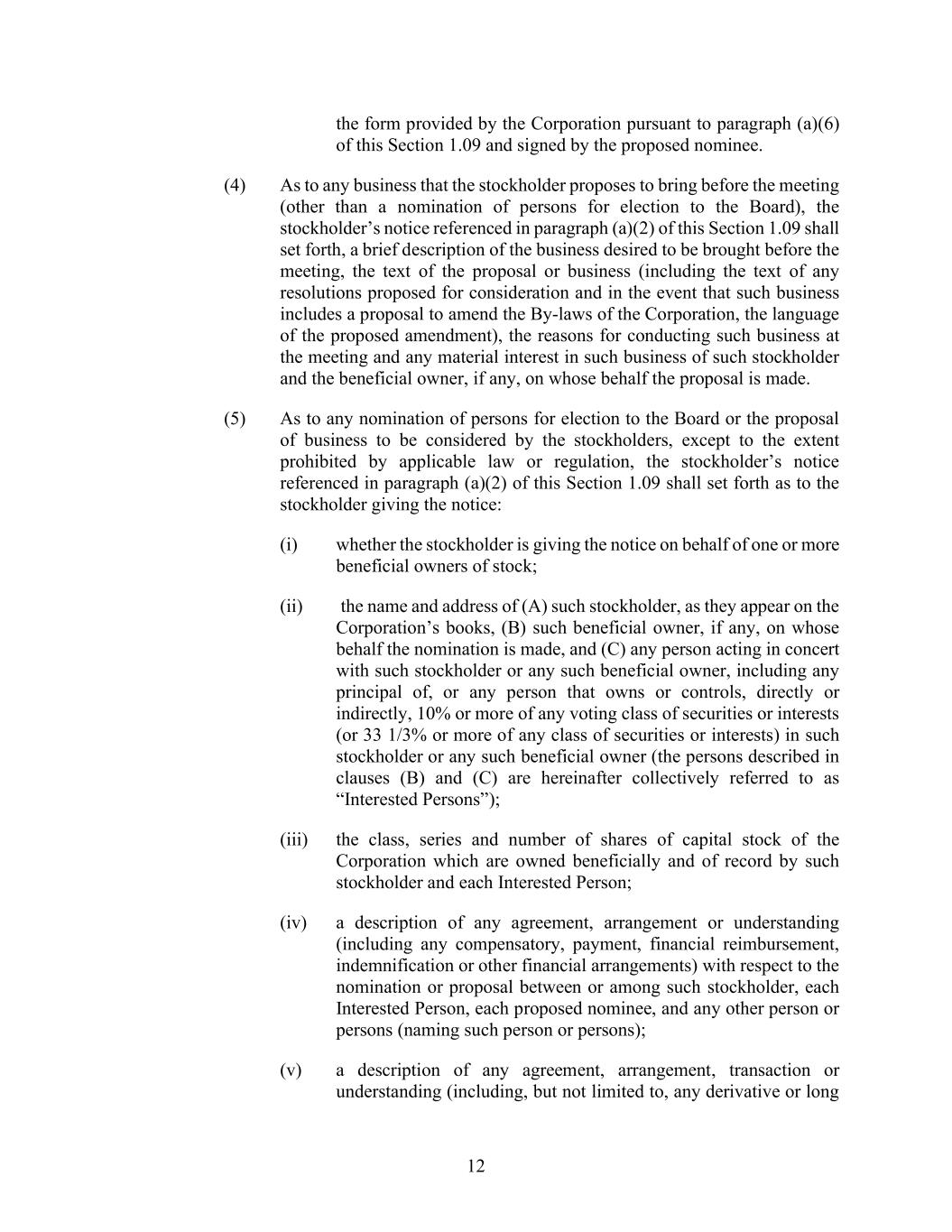 12 the form provided by the Corporation pursuant to paragraph (a)(6) of this Section 1.09 and signed by the proposed nominee. (4) As to any business that the stockholder proposes to bring before the meeting (other than a nomination of persons for election to the Board), the stockholder’s notice referenced in paragraph (a)(2) of this Section 1.09 shall set forth, a brief description of the business desired to be brought before the meeting, the text of the proposal or business (including the text of any resolutions proposed for consideration and in the event that such business includes a proposal to amend the By-laws of the Corporation, the language of the proposed amendment), the reasons for conducting such business at the meeting and any material interest in such business of such stockholder and the beneficial owner, if any, on whose behalf the proposal is made. (5) As to any nomination of persons for election to the Board or the proposal of business to be considered by the stockholders, except to the extent prohibited by applicable law or regulation, the stockholder’s notice referenced in paragraph (a)(2) of this Section 1.09 shall set forth as to the stockholder giving the notice: (i) whether the stockholder is giving the notice on behalf of one or more beneficial owners of stock; (ii) the name and address of (A) such stockholder, as they appear on the Corporation’s books, (B) such beneficial owner, if any, on whose behalf the nomination is made, and (C) any person acting in concert with such stockholder or any such beneficial owner, including any principal of, or any person that owns or controls, directly or indirectly, 10% or more of any voting class of securities or interests (or 33 1/3% or more of any class of securities or interests) in such stockholder or any such beneficial owner (the persons described in clauses (B) and (C) are hereinafter collectively referred to as “Interested Persons”); (iii) the class, series and number of shares of capital stock of the Corporation which are owned beneficially and of record by such stockholder and each Interested Person; (iv) a description of any agreement, arrangement or understanding (including any compensatory, payment, financial reimbursement, indemnification or other financial arrangements) with respect to the nomination or proposal between or among such stockholder, each Interested Person, each proposed nominee, and any other person or persons (naming such person or persons); (v) a description of any agreement, arrangement, transaction or understanding (including, but not limited to, any derivative or long