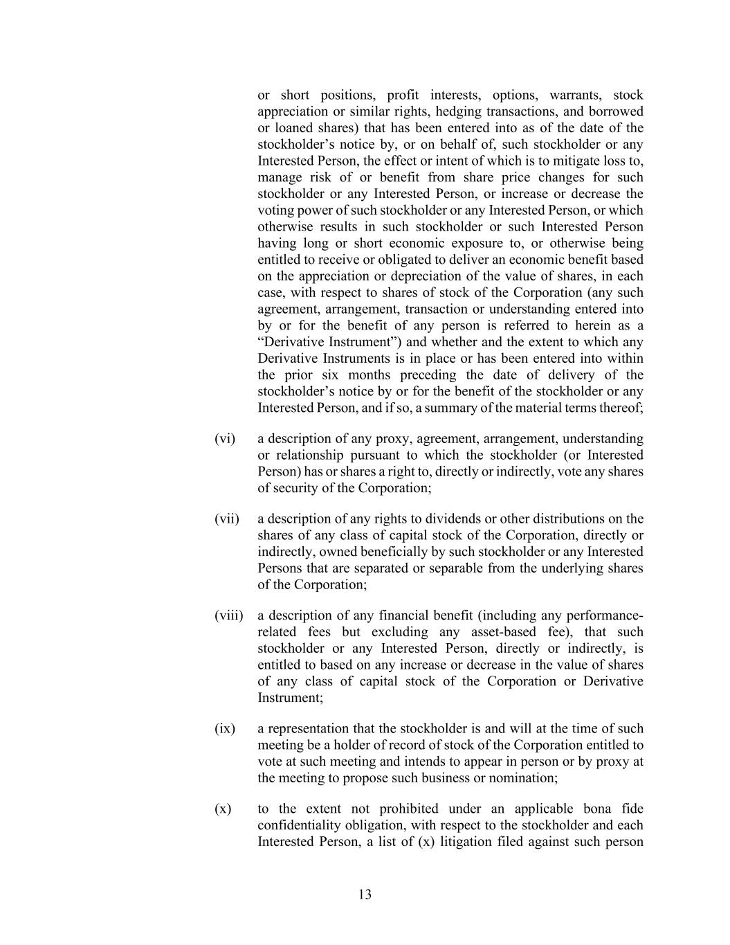 13 or short positions, profit interests, options, warrants, stock appreciation or similar rights, hedging transactions, and borrowed or loaned shares) that has been entered into as of the date of the stockholder’s notice by, or on behalf of, such stockholder or any Interested Person, the effect or intent of which is to mitigate loss to, manage risk of or benefit from share price changes for such stockholder or any Interested Person, or increase or decrease the voting power of such stockholder or any Interested Person, or which otherwise results in such stockholder or such Interested Person having long or short economic exposure to, or otherwise being entitled to receive or obligated to deliver an economic benefit based on the appreciation or depreciation of the value of shares, in each case, with respect to shares of stock of the Corporation (any such agreement, arrangement, transaction or understanding entered into by or for the benefit of any person is referred to herein as a “Derivative Instrument”) and whether and the extent to which any Derivative Instruments is in place or has been entered into within the prior six months preceding the date of delivery of the stockholder’s notice by or for the benefit of the stockholder or any Interested Person, and if so, a summary of the material terms thereof; (vi) a description of any proxy, agreement, arrangement, understanding or relationship pursuant to which the stockholder (or Interested Person) has or shares a right to, directly or indirectly, vote any shares of security of the Corporation; (vii) a description of any rights to dividends or other distributions on the shares of any class of capital stock of the Corporation, directly or indirectly, owned beneficially by such stockholder or any Interested Persons that are separated or separable from the underlying shares of the Corporation; (viii) a description of any financial benefit (including any performance- related fees but excluding any asset-based fee), that such stockholder or any Interested Person, directly or indirectly, is entitled to based on any increase or decrease in the value of shares of any class of capital stock of the Corporation or Derivative Instrument; (ix) a representation that the stockholder is and will at the time of such meeting be a holder of record of stock of the Corporation entitled to vote at such meeting and intends to appear in person or by proxy at the meeting to propose such business or nomination; (x) to the extent not prohibited under an applicable bona fide confidentiality obligation, with respect to the stockholder and each Interested Person, a list of (x) litigation filed against such person
