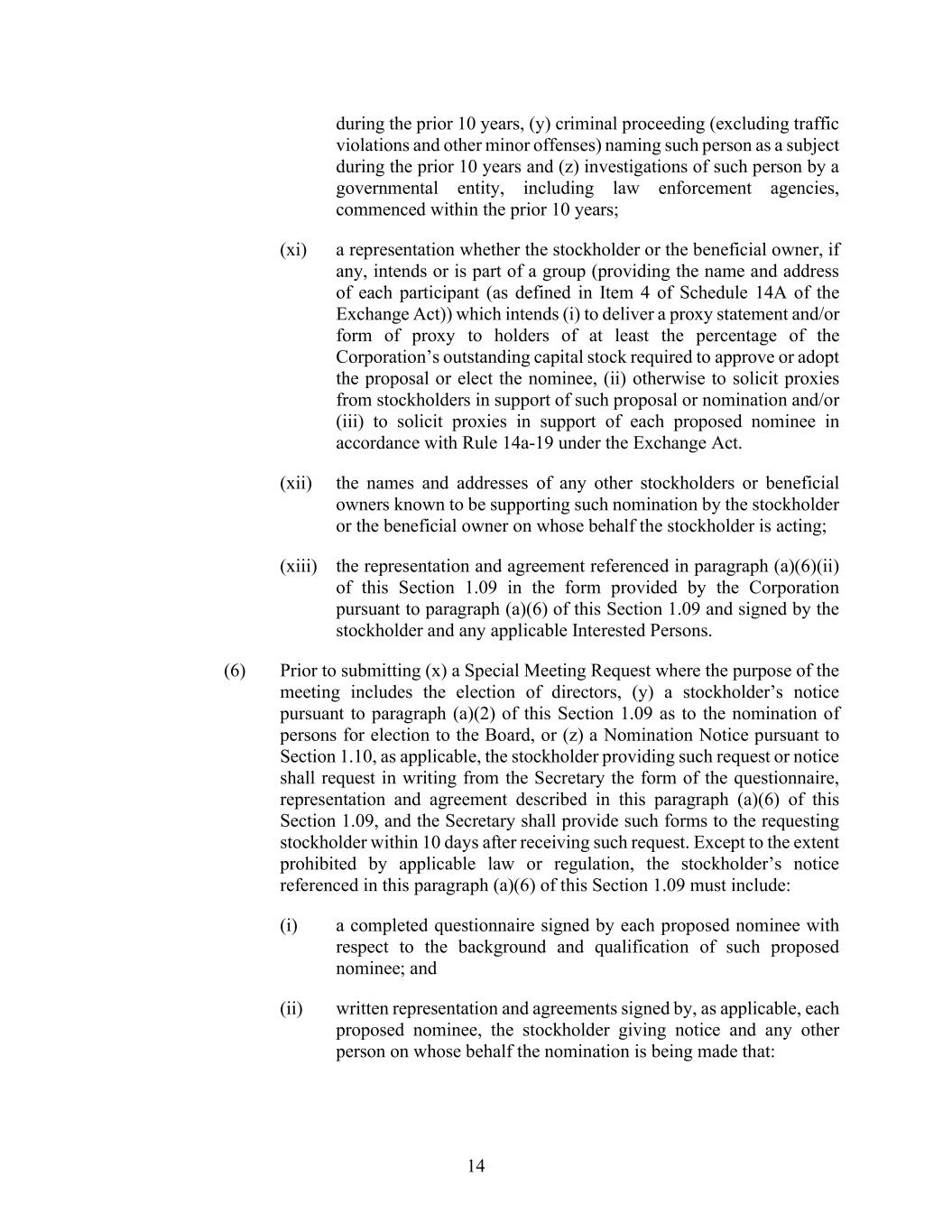 14 during the prior 10 years, (y) criminal proceeding (excluding traffic violations and other minor offenses) naming such person as a subject during the prior 10 years and (z) investigations of such person by a governmental entity, including law enforcement agencies, commenced within the prior 10 years; (xi) a representation whether the stockholder or the beneficial owner, if any, intends or is part of a group (providing the name and address of each participant (as defined in Item 4 of Schedule 14A of the Exchange Act)) which intends (i) to deliver a proxy statement and/or form of proxy to holders of at least the percentage of the Corporation’s outstanding capital stock required to approve or adopt the proposal or elect the nominee, (ii) otherwise to solicit proxies from stockholders in support of such proposal or nomination and/or (iii) to solicit proxies in support of each proposed nominee in accordance with Rule 14a-19 under the Exchange Act. (xii) the names and addresses of any other stockholders or beneficial owners known to be supporting such nomination by the stockholder or the beneficial owner on whose behalf the stockholder is acting; (xiii) the representation and agreement referenced in paragraph (a)(6)(ii) of this Section 1.09 in the form provided by the Corporation pursuant to paragraph (a)(6) of this Section 1.09 and signed by the stockholder and any applicable Interested Persons. (6) Prior to submitting (x) a Special Meeting Request where the purpose of the meeting includes the election of directors, (y) a stockholder’s notice pursuant to paragraph (a)(2) of this Section 1.09 as to the nomination of persons for election to the Board, or (z) a Nomination Notice pursuant to Section 1.10, as applicable, the stockholder providing such request or notice shall request in writing from the Secretary the form of the questionnaire, representation and agreement described in this paragraph (a)(6) of this Section 1.09, and the Secretary shall provide such forms to the requesting stockholder within 10 days after receiving such request. Except to the extent prohibited by applicable law or regulation, the stockholder’s notice referenced in this paragraph (a)(6) of this Section 1.09 must include: (i) a completed questionnaire signed by each proposed nominee with respect to the background and qualification of such proposed nominee; and (ii) written representation and agreements signed by, as applicable, each proposed nominee, the stockholder giving notice and any other person on whose behalf the nomination is being made that: