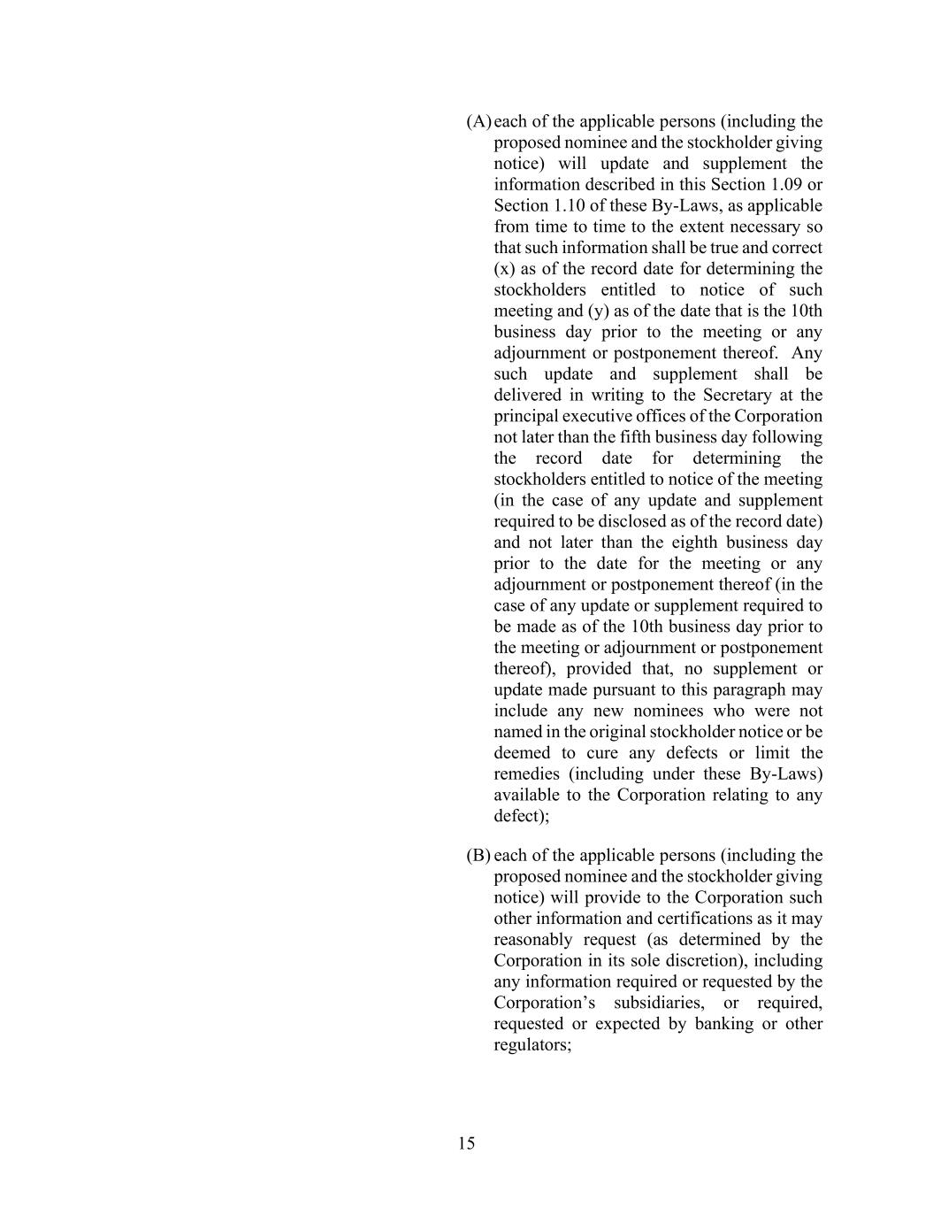 15 (A) each of the applicable persons (including the proposed nominee and the stockholder giving notice) will update and supplement the information described in this Section 1.09 or Section 1.10 of these By-Laws, as applicable from time to time to the extent necessary so that such information shall be true and correct (x) as of the record date for determining the stockholders entitled to notice of such meeting and (y) as of the date that is the 10th business day prior to the meeting or any adjournment or postponement thereof. Any such update and supplement shall be delivered in writing to the Secretary at the principal executive offices of the Corporation not later than the fifth business day following the record date for determining the stockholders entitled to notice of the meeting (in the case of any update and supplement required to be disclosed as of the record date) and not later than the eighth business day prior to the date for the meeting or any adjournment or postponement thereof (in the case of any update or supplement required to be made as of the 10th business day prior to the meeting or adjournment or postponement thereof), provided that, no supplement or update made pursuant to this paragraph may include any new nominees who were not named in the original stockholder notice or be deemed to cure any defects or limit the remedies (including under these By-Laws) available to the Corporation relating to any defect); (B) each of the applicable persons (including the proposed nominee and the stockholder giving notice) will provide to the Corporation such other information and certifications as it may reasonably request (as determined by the Corporation in its sole discretion), including any information required or requested by the Corporation’s subsidiaries, or required, requested or expected by banking or other regulators;