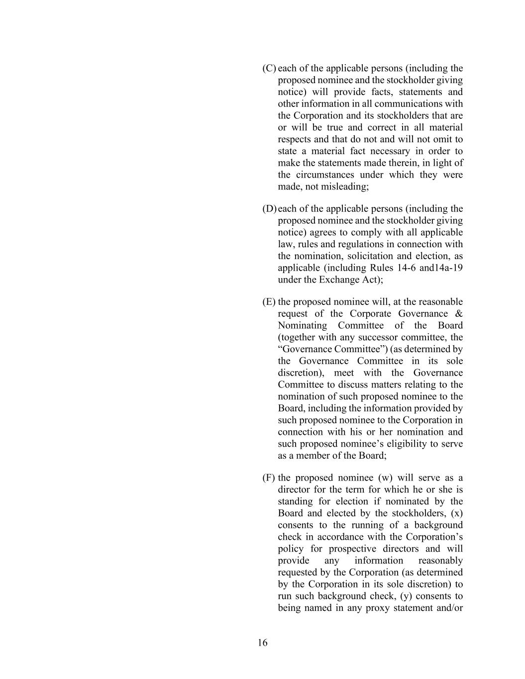 16 (C) each of the applicable persons (including the proposed nominee and the stockholder giving notice) will provide facts, statements and other information in all communications with the Corporation and its stockholders that are or will be true and correct in all material respects and that do not and will not omit to state a material fact necessary in order to make the statements made therein, in light of the circumstances under which they were made, not misleading; (D) each of the applicable persons (including the proposed nominee and the stockholder giving notice) agrees to comply with all applicable law, rules and regulations in connection with the nomination, solicitation and election, as applicable (including Rules 14-6 and14a-19 under the Exchange Act); (E) the proposed nominee will, at the reasonable request of the Corporate Governance & Nominating Committee of the Board (together with any successor committee, the “Governance Committee”) (as determined by the Governance Committee in its sole discretion), meet with the Governance Committee to discuss matters relating to the nomination of such proposed nominee to the Board, including the information provided by such proposed nominee to the Corporation in connection with his or her nomination and such proposed nominee’s eligibility to serve as a member of the Board; (F) the proposed nominee (w) will serve as a director for the term for which he or she is standing for election if nominated by the Board and elected by the stockholders, (x) consents to the running of a background check in accordance with the Corporation’s policy for prospective directors and will provide any information reasonably requested by the Corporation (as determined by the Corporation in its sole discretion) to run such background check, (y) consents to being named in any proxy statement and/or