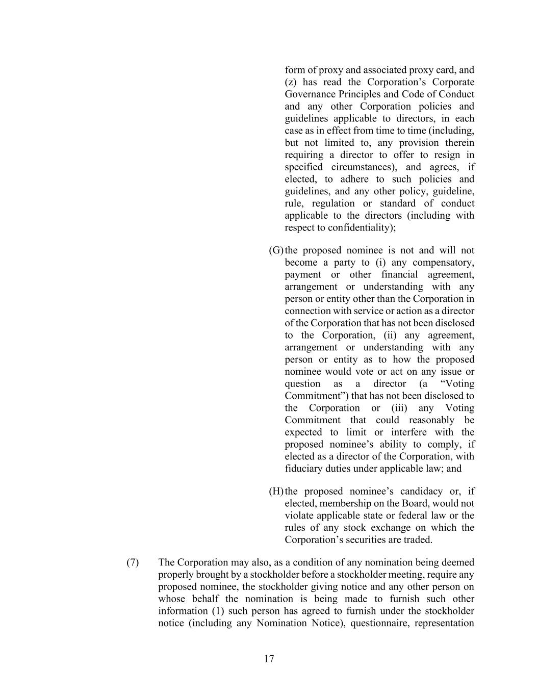 17 form of proxy and associated proxy card, and (z) has read the Corporation’s Corporate Governance Principles and Code of Conduct and any other Corporation policies and guidelines applicable to directors, in each case as in effect from time to time (including, but not limited to, any provision therein requiring a director to offer to resign in specified circumstances), and agrees, if elected, to adhere to such policies and guidelines, and any other policy, guideline, rule, regulation or standard of conduct applicable to the directors (including with respect to confidentiality); (G) the proposed nominee is not and will not become a party to (i) any compensatory, payment or other financial agreement, arrangement or understanding with any person or entity other than the Corporation in connection with service or action as a director of the Corporation that has not been disclosed to the Corporation, (ii) any agreement, arrangement or understanding with any person or entity as to how the proposed nominee would vote or act on any issue or question as a director (a “Voting Commitment”) that has not been disclosed to the Corporation or (iii) any Voting Commitment that could reasonably be expected to limit or interfere with the proposed nominee’s ability to comply, if elected as a director of the Corporation, with fiduciary duties under applicable law; and (H) the proposed nominee’s candidacy or, if elected, membership on the Board, would not violate applicable state or federal law or the rules of any stock exchange on which the Corporation’s securities are traded. (7) The Corporation may also, as a condition of any nomination being deemed properly brought by a stockholder before a stockholder meeting, require any proposed nominee, the stockholder giving notice and any other person on whose behalf the nomination is being made to furnish such other information (1) such person has agreed to furnish under the stockholder notice (including any Nomination Notice), questionnaire, representation