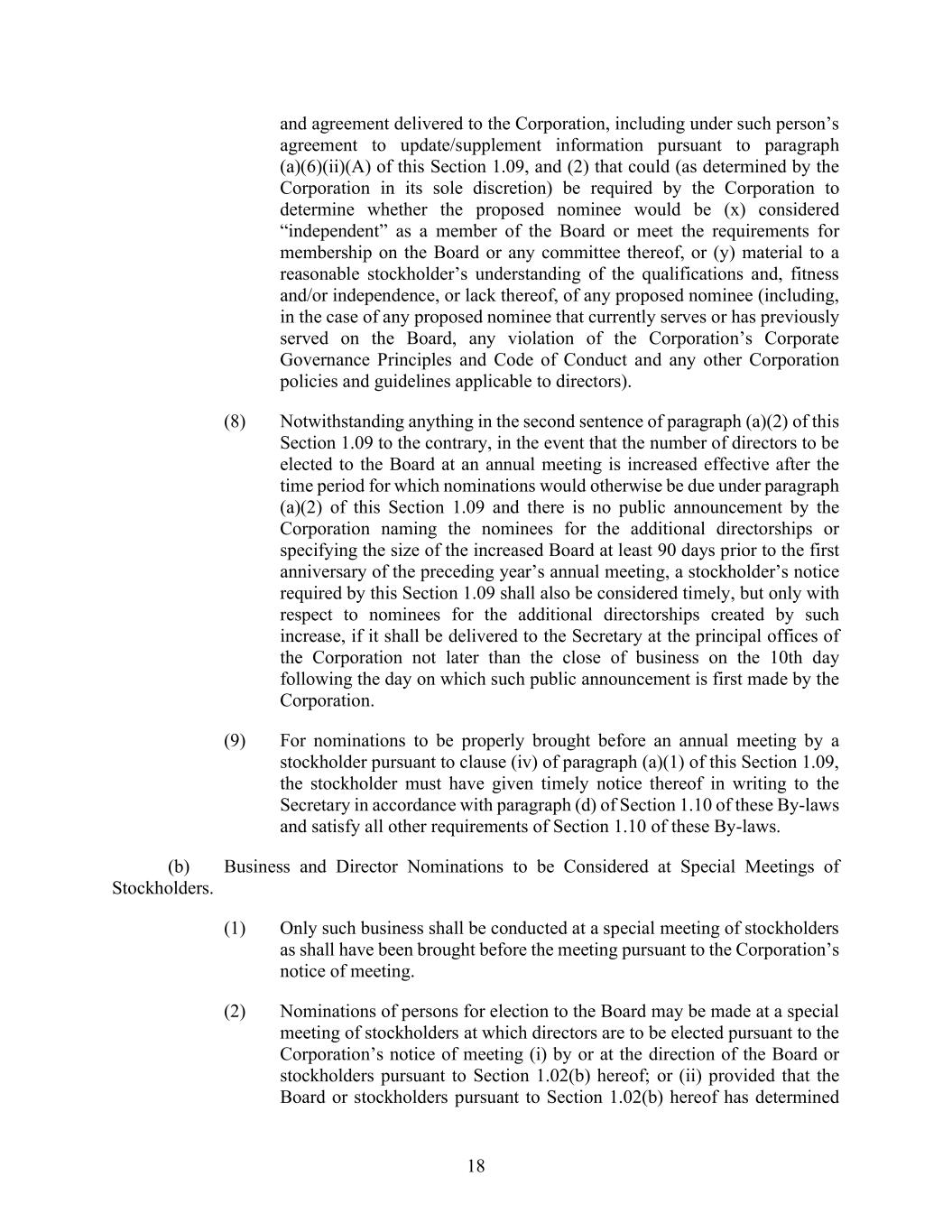 18 and agreement delivered to the Corporation, including under such person’s agreement to update/supplement information pursuant to paragraph (a)(6)(ii)(A) of this Section 1.09, and (2) that could (as determined by the Corporation in its sole discretion) be required by the Corporation to determine whether the proposed nominee would be (x) considered “independent” as a member of the Board or meet the requirements for membership on the Board or any committee thereof, or (y) material to a reasonable stockholder’s understanding of the qualifications and, fitness and/or independence, or lack thereof, of any proposed nominee (including, in the case of any proposed nominee that currently serves or has previously served on the Board, any violation of the Corporation’s Corporate Governance Principles and Code of Conduct and any other Corporation policies and guidelines applicable to directors). (8) Notwithstanding anything in the second sentence of paragraph (a)(2) of this Section 1.09 to the contrary, in the event that the number of directors to be elected to the Board at an annual meeting is increased effective after the time period for which nominations would otherwise be due under paragraph (a)(2) of this Section 1.09 and there is no public announcement by the Corporation naming the nominees for the additional directorships or specifying the size of the increased Board at least 90 days prior to the first anniversary of the preceding year’s annual meeting, a stockholder’s notice required by this Section 1.09 shall also be considered timely, but only with respect to nominees for the additional directorships created by such increase, if it shall be delivered to the Secretary at the principal offices of the Corporation not later than the close of business on the 10th day following the day on which such public announcement is first made by the Corporation. (9) For nominations to be properly brought before an annual meeting by a stockholder pursuant to clause (iv) of paragraph (a)(1) of this Section 1.09, the stockholder must have given timely notice thereof in writing to the Secretary in accordance with paragraph (d) of Section 1.10 of these By-laws and satisfy all other requirements of Section 1.10 of these By-laws. (b) Business and Director Nominations to be Considered at Special Meetings of Stockholders. (1) Only such business shall be conducted at a special meeting of stockholders as shall have been brought before the meeting pursuant to the Corporation’s notice of meeting. (2) Nominations of persons for election to the Board may be made at a special meeting of stockholders at which directors are to be elected pursuant to the Corporation’s notice of meeting (i) by or at the direction of the Board or stockholders pursuant to Section 1.02(b) hereof; or (ii) provided that the Board or stockholders pursuant to Section 1.02(b) hereof has determined