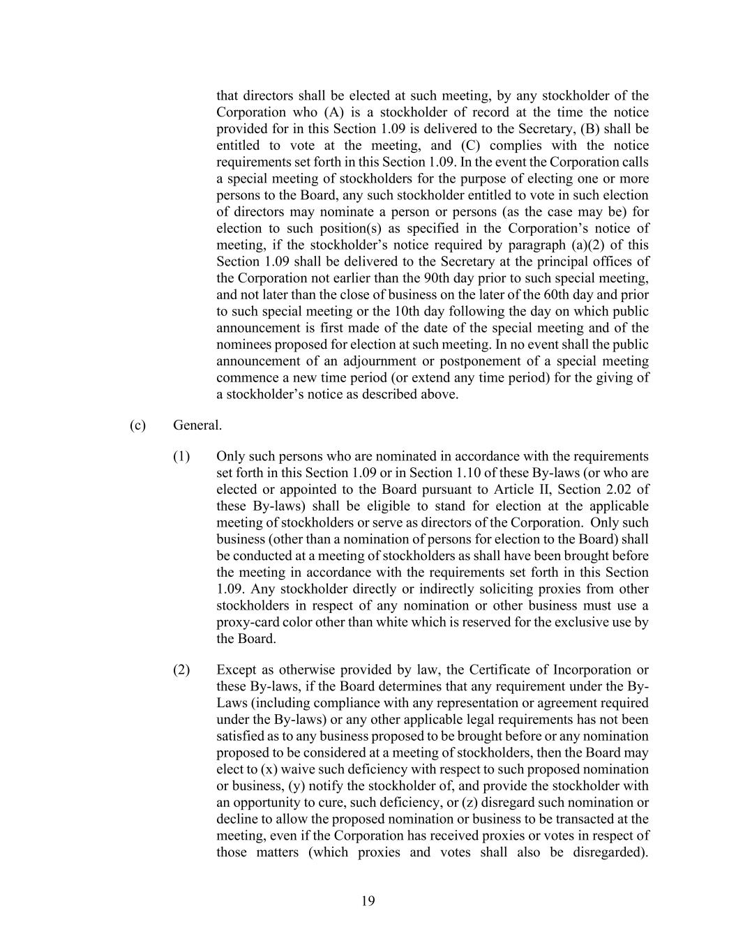 19 that directors shall be elected at such meeting, by any stockholder of the Corporation who (A) is a stockholder of record at the time the notice provided for in this Section 1.09 is delivered to the Secretary, (B) shall be entitled to vote at the meeting, and (C) complies with the notice requirements set forth in this Section 1.09. In the event the Corporation calls a special meeting of stockholders for the purpose of electing one or more persons to the Board, any such stockholder entitled to vote in such election of directors may nominate a person or persons (as the case may be) for election to such position(s) as specified in the Corporation’s notice of meeting, if the stockholder’s notice required by paragraph (a)(2) of this Section 1.09 shall be delivered to the Secretary at the principal offices of the Corporation not earlier than the 90th day prior to such special meeting, and not later than the close of business on the later of the 60th day and prior to such special meeting or the 10th day following the day on which public announcement is first made of the date of the special meeting and of the nominees proposed for election at such meeting. In no event shall the public announcement of an adjournment or postponement of a special meeting commence a new time period (or extend any time period) for the giving of a stockholder’s notice as described above. (c) General. (1) Only such persons who are nominated in accordance with the requirements set forth in this Section 1.09 or in Section 1.10 of these By-laws (or who are elected or appointed to the Board pursuant to Article II, Section 2.02 of these By-laws) shall be eligible to stand for election at the applicable meeting of stockholders or serve as directors of the Corporation. Only such business (other than a nomination of persons for election to the Board) shall be conducted at a meeting of stockholders as shall have been brought before the meeting in accordance with the requirements set forth in this Section 1.09. Any stockholder directly or indirectly soliciting proxies from other stockholders in respect of any nomination or other business must use a proxy-card color other than white which is reserved for the exclusive use by the Board. (2) Except as otherwise provided by law, the Certificate of Incorporation or these By-laws, if the Board determines that any requirement under the By- Laws (including compliance with any representation or agreement required under the By-laws) or any other applicable legal requirements has not been satisfied as to any business proposed to be brought before or any nomination proposed to be considered at a meeting of stockholders, then the Board may elect to (x) waive such deficiency with respect to such proposed nomination or business, (y) notify the stockholder of, and provide the stockholder with an opportunity to cure, such deficiency, or (z) disregard such nomination or decline to allow the proposed nomination or business to be transacted at the meeting, even if the Corporation has received proxies or votes in respect of those matters (which proxies and votes shall also be disregarded).