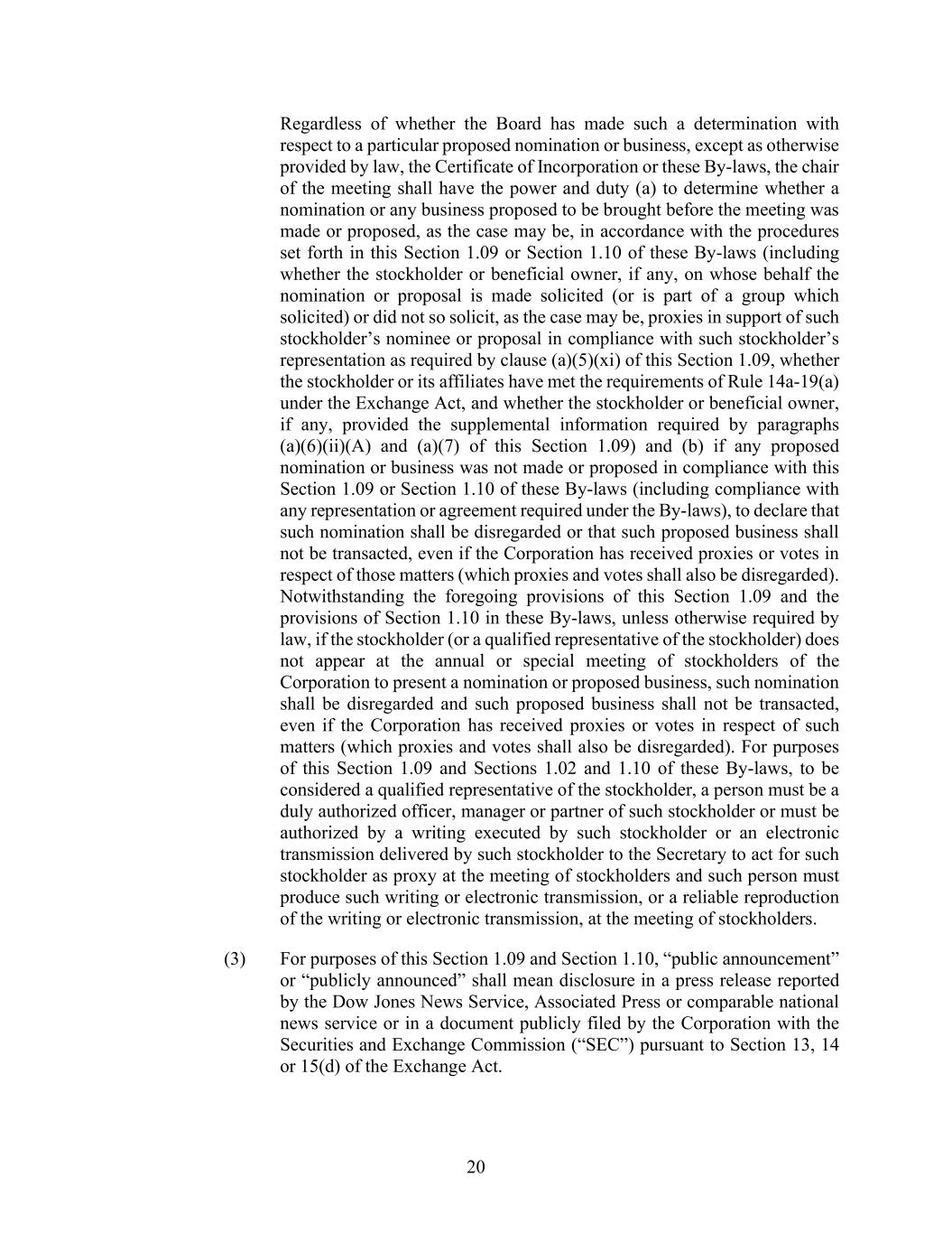 20 Regardless of whether the Board has made such a determination with respect to a particular proposed nomination or business, except as otherwise provided by law, the Certificate of Incorporation or these By-laws, the chair of the meeting shall have the power and duty (a) to determine whether a nomination or any business proposed to be brought before the meeting was made or proposed, as the case may be, in accordance with the procedures set forth in this Section 1.09 or Section 1.10 of these By-laws (including whether the stockholder or beneficial owner, if any, on whose behalf the nomination or proposal is made solicited (or is part of a group which solicited) or did not so solicit, as the case may be, proxies in support of such stockholder’s nominee or proposal in compliance with such stockholder’s representation as required by clause (a)(5)(xi) of this Section 1.09, whether the stockholder or its affiliates have met the requirements of Rule 14a-19(a) under the Exchange Act, and whether the stockholder or beneficial owner, if any, provided the supplemental information required by paragraphs (a)(6)(ii)(A) and (a)(7) of this Section 1.09) and (b) if any proposed nomination or business was not made or proposed in compliance with this Section 1.09 or Section 1.10 of these By-laws (including compliance with any representation or agreement required under the By-laws), to declare that such nomination shall be disregarded or that such proposed business shall not be transacted, even if the Corporation has received proxies or votes in respect of those matters (which proxies and votes shall also be disregarded). Notwithstanding the foregoing provisions of this Section 1.09 and the provisions of Section 1.10 in these By-laws, unless otherwise required by law, if the stockholder (or a qualified representative of the stockholder) does not appear at the annual or special meeting of stockholders of the Corporation to present a nomination or proposed business, such nomination shall be disregarded and such proposed business shall not be transacted, even if the Corporation has received proxies or votes in respect of such matters (which proxies and votes shall also be disregarded). For purposes of this Section 1.09 and Sections 1.02 and 1.10 of these By-laws, to be considered a qualified representative of the stockholder, a person must be a duly authorized officer, manager or partner of such stockholder or must be authorized by a writing executed by such stockholder or an electronic transmission delivered by such stockholder to the Secretary to act for such stockholder as proxy at the meeting of stockholders and such person must produce such writing or electronic transmission, or a reliable reproduction of the writing or electronic transmission, at the meeting of stockholders. (3) For purposes of this Section 1.09 and Section 1.10, “public announcement” or “publicly announced” shall mean disclosure in a press release reported by the Dow Jones News Service, Associated Press or comparable national news service or in a document publicly filed by the Corporation with the Securities and Exchange Commission (“SEC”) pursuant to Section 13, 14 or 15(d) of the Exchange Act.