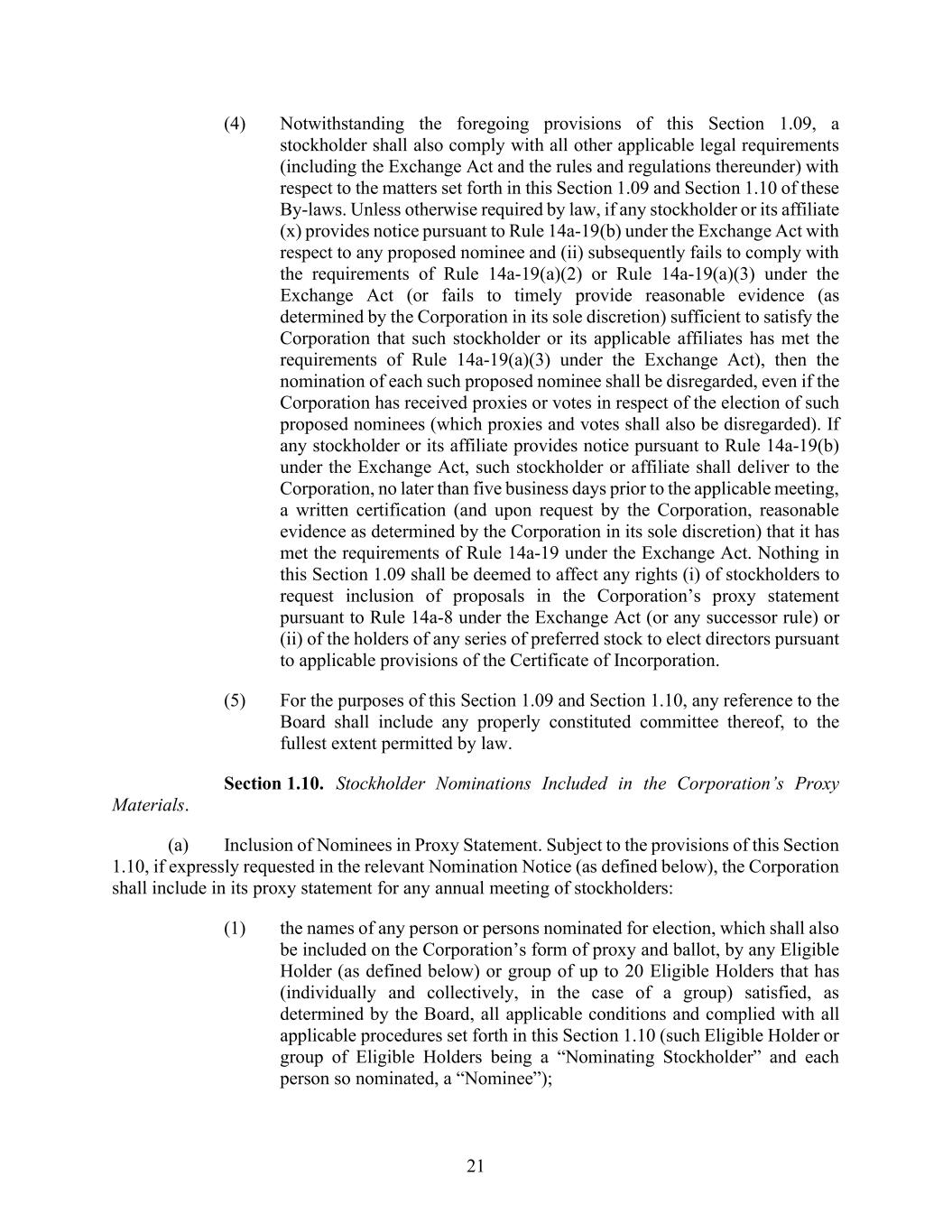21 (4) Notwithstanding the foregoing provisions of this Section 1.09, a stockholder shall also comply with all other applicable legal requirements (including the Exchange Act and the rules and regulations thereunder) with respect to the matters set forth in this Section 1.09 and Section 1.10 of these By-laws. Unless otherwise required by law, if any stockholder or its affiliate (x) provides notice pursuant to Rule 14a-19(b) under the Exchange Act with respect to any proposed nominee and (ii) subsequently fails to comply with the requirements of Rule 14a-19(a)(2) or Rule 14a-19(a)(3) under the Exchange Act (or fails to timely provide reasonable evidence (as determined by the Corporation in its sole discretion) sufficient to satisfy the Corporation that such stockholder or its applicable affiliates has met the requirements of Rule 14a-19(a)(3) under the Exchange Act), then the nomination of each such proposed nominee shall be disregarded, even if the Corporation has received proxies or votes in respect of the election of such proposed nominees (which proxies and votes shall also be disregarded). If any stockholder or its affiliate provides notice pursuant to Rule 14a-19(b) under the Exchange Act, such stockholder or affiliate shall deliver to the Corporation, no later than five business days prior to the applicable meeting, a written certification (and upon request by the Corporation, reasonable evidence as determined by the Corporation in its sole discretion) that it has met the requirements of Rule 14a-19 under the Exchange Act. Nothing in this Section 1.09 shall be deemed to affect any rights (i) of stockholders to request inclusion of proposals in the Corporation’s proxy statement pursuant to Rule 14a-8 under the Exchange Act (or any successor rule) or (ii) of the holders of any series of preferred stock to elect directors pursuant to applicable provisions of the Certificate of Incorporation. (5) For the purposes of this Section 1.09 and Section 1.10, any reference to the Board shall include any properly constituted committee thereof, to the fullest extent permitted by law. Section 1.10. Stockholder Nominations Included in the Corporation’s Proxy Materials. (a) Inclusion of Nominees in Proxy Statement. Subject to the provisions of this Section 1.10, if expressly requested in the relevant Nomination Notice (as defined below), the Corporation shall include in its proxy statement for any annual meeting of stockholders: (1) the names of any person or persons nominated for election, which shall also be included on the Corporation’s form of proxy and ballot, by any Eligible Holder (as defined below) or group of up to 20 Eligible Holders that has (individually and collectively, in the case of a group) satisfied, as determined by the Board, all applicable conditions and complied with all applicable procedures set forth in this Section 1.10 (such Eligible Holder or group of Eligible Holders being a “Nominating Stockholder” and each person so nominated, a “Nominee”);