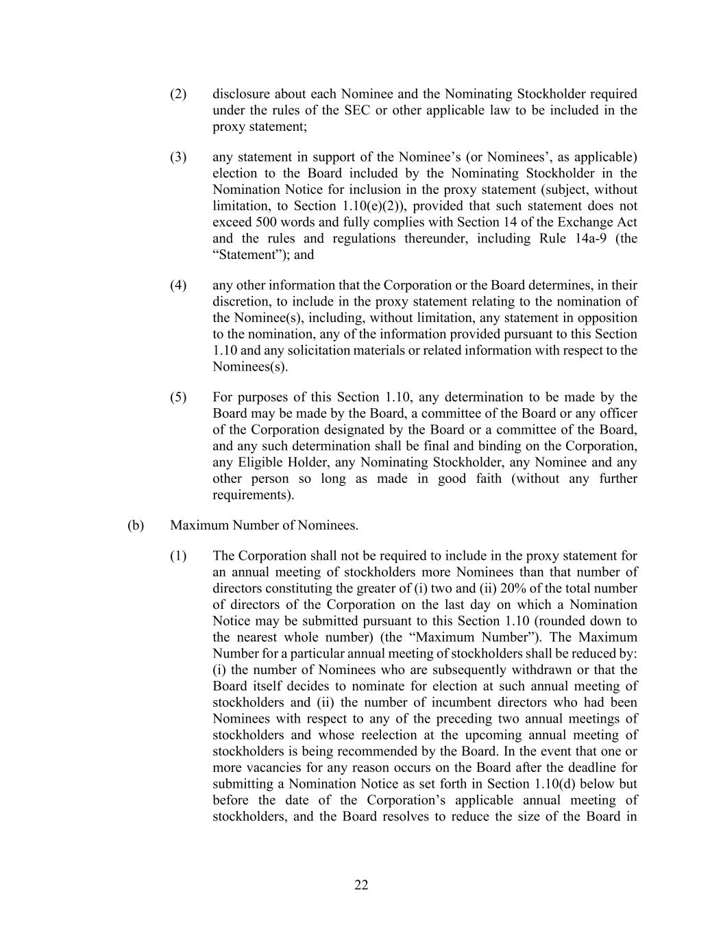 22 (2) disclosure about each Nominee and the Nominating Stockholder required under the rules of the SEC or other applicable law to be included in the proxy statement; (3) any statement in support of the Nominee’s (or Nominees’, as applicable) election to the Board included by the Nominating Stockholder in the Nomination Notice for inclusion in the proxy statement (subject, without limitation, to Section 1.10(e)(2)), provided that such statement does not exceed 500 words and fully complies with Section 14 of the Exchange Act and the rules and regulations thereunder, including Rule 14a-9 (the “Statement”); and (4) any other information that the Corporation or the Board determines, in their discretion, to include in the proxy statement relating to the nomination of the Nominee(s), including, without limitation, any statement in opposition to the nomination, any of the information provided pursuant to this Section 1.10 and any solicitation materials or related information with respect to the Nominees(s). (5) For purposes of this Section 1.10, any determination to be made by the Board may be made by the Board, a committee of the Board or any officer of the Corporation designated by the Board or a committee of the Board, and any such determination shall be final and binding on the Corporation, any Eligible Holder, any Nominating Stockholder, any Nominee and any other person so long as made in good faith (without any further requirements). (b) Maximum Number of Nominees. (1) The Corporation shall not be required to include in the proxy statement for an annual meeting of stockholders more Nominees than that number of directors constituting the greater of (i) two and (ii) 20% of the total number of directors of the Corporation on the last day on which a Nomination Notice may be submitted pursuant to this Section 1.10 (rounded down to the nearest whole number) (the “Maximum Number”). The Maximum Number for a particular annual meeting of stockholders shall be reduced by: (i) the number of Nominees who are subsequently withdrawn or that the Board itself decides to nominate for election at such annual meeting of stockholders and (ii) the number of incumbent directors who had been Nominees with respect to any of the preceding two annual meetings of stockholders and whose reelection at the upcoming annual meeting of stockholders is being recommended by the Board. In the event that one or more vacancies for any reason occurs on the Board after the deadline for submitting a Nomination Notice as set forth in Section 1.10(d) below but before the date of the Corporation’s applicable annual meeting of stockholders, and the Board resolves to reduce the size of the Board in
