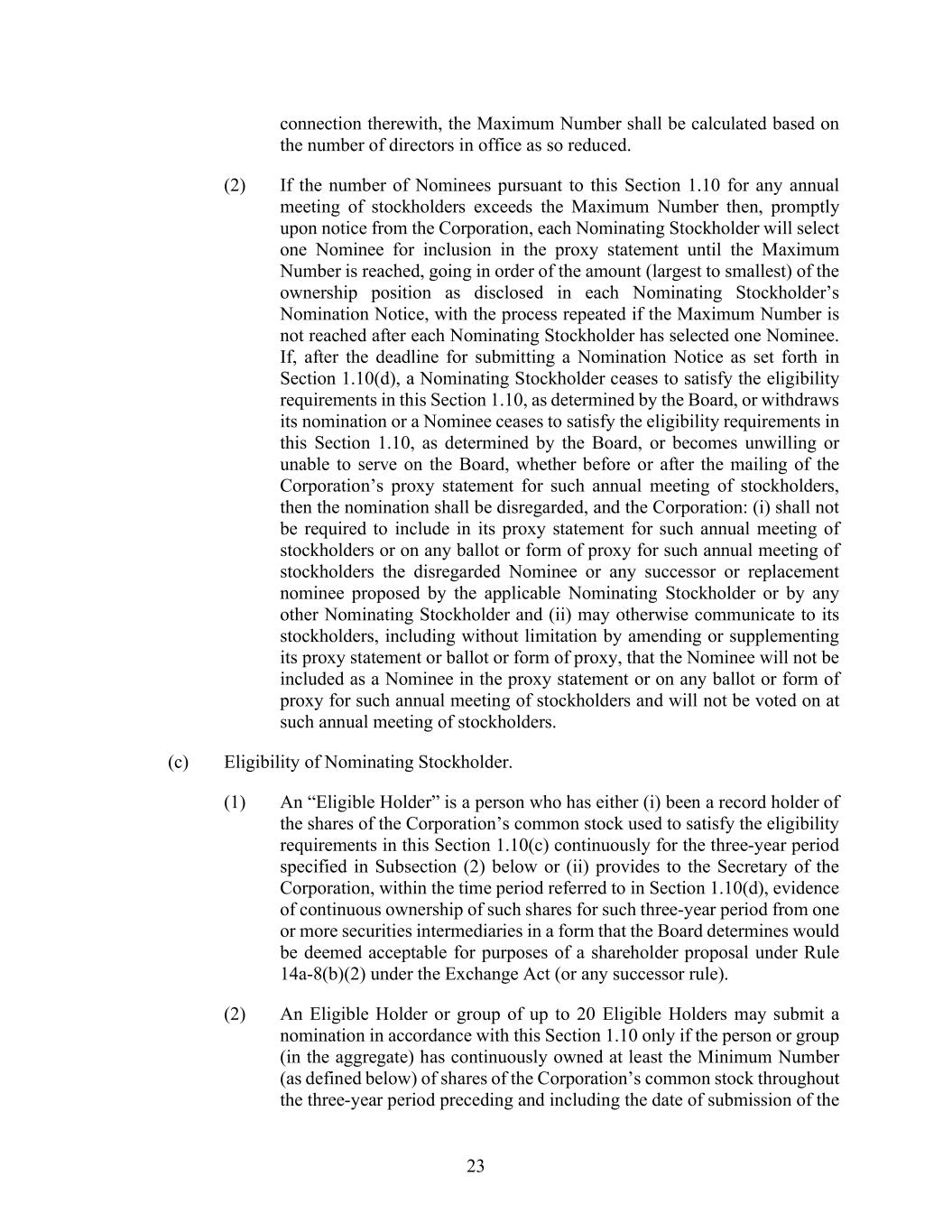 23 connection therewith, the Maximum Number shall be calculated based on the number of directors in office as so reduced. (2) If the number of Nominees pursuant to this Section 1.10 for any annual meeting of stockholders exceeds the Maximum Number then, promptly upon notice from the Corporation, each Nominating Stockholder will select one Nominee for inclusion in the proxy statement until the Maximum Number is reached, going in order of the amount (largest to smallest) of the ownership position as disclosed in each Nominating Stockholder’s Nomination Notice, with the process repeated if the Maximum Number is not reached after each Nominating Stockholder has selected one Nominee. If, after the deadline for submitting a Nomination Notice as set forth in Section 1.10(d), a Nominating Stockholder ceases to satisfy the eligibility requirements in this Section 1.10, as determined by the Board, or withdraws its nomination or a Nominee ceases to satisfy the eligibility requirements in this Section 1.10, as determined by the Board, or becomes unwilling or unable to serve on the Board, whether before or after the mailing of the Corporation’s proxy statement for such annual meeting of stockholders, then the nomination shall be disregarded, and the Corporation: (i) shall not be required to include in its proxy statement for such annual meeting of stockholders or on any ballot or form of proxy for such annual meeting of stockholders the disregarded Nominee or any successor or replacement nominee proposed by the applicable Nominating Stockholder or by any other Nominating Stockholder and (ii) may otherwise communicate to its stockholders, including without limitation by amending or supplementing its proxy statement or ballot or form of proxy, that the Nominee will not be included as a Nominee in the proxy statement or on any ballot or form of proxy for such annual meeting of stockholders and will not be voted on at such annual meeting of stockholders. (c) Eligibility of Nominating Stockholder. (1) An “Eligible Holder” is a person who has either (i) been a record holder of the shares of the Corporation’s common stock used to satisfy the eligibility requirements in this Section 1.10(c) continuously for the three-year period specified in Subsection (2) below or (ii) provides to the Secretary of the Corporation, within the time period referred to in Section 1.10(d), evidence of continuous ownership of such shares for such three-year period from one or more securities intermediaries in a form that the Board determines would be deemed acceptable for purposes of a shareholder proposal under Rule 14a-8(b)(2) under the Exchange Act (or any successor rule). (2) An Eligible Holder or group of up to 20 Eligible Holders may submit a nomination in accordance with this Section 1.10 only if the person or group (in the aggregate) has continuously owned at least the Minimum Number (as defined below) of shares of the Corporation’s common stock throughout the three-year period preceding and including the date of submission of the