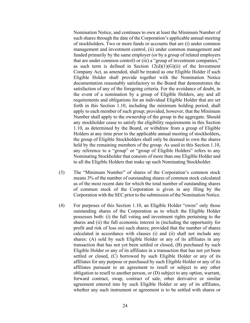 24 Nomination Notice, and continues to own at least the Minimum Number of such shares through the date of the Corporation’s applicable annual meeting of stockholders. Two or more funds or accounts that are (i) under common management and investment control, (ii) under common management and funded primarily by the same employer (or by a group of related employers that are under common control) or (iii) a “group of investment companies,” as such term is defined in Section 12(d)(1)(G)(ii) of the Investment Company Act, as amended, shall be treated as one Eligible Holder if such Eligible Holder shall provide together with the Nomination Notice documentation reasonably satisfactory to the Board that demonstrates the satisfaction of any of the foregoing criteria. For the avoidance of doubt, in the event of a nomination by a group of Eligible Holders, any and all requirements and obligations for an individual Eligible Holder that are set forth in this Section 1.10, including the minimum holding period, shall apply to each member of such group; provided, however, that the Minimum Number shall apply to the ownership of the group in the aggregate. Should any stockholder cease to satisfy the eligibility requirements in this Section 1.10, as determined by the Board, or withdraw from a group of Eligible Holders at any time prior to the applicable annual meeting of stockholders, the group of Eligible Stockholders shall only be deemed to own the shares held by the remaining members of the group. As used in this Section 1.10, any reference to a “group” or “group of Eligible Holders” refers to any Nominating Stockholder that consists of more than one Eligible Holder and to all the Eligible Holders that make up such Nominating Stockholder. (3) The “Minimum Number” of shares of the Corporation’s common stock means 3% of the number of outstanding shares of common stock calculated as of the most recent date for which the total number of outstanding shares of common stock of the Corporation is given in any filing by the Corporation with the SEC prior to the submission of the Nomination Notice. (4) For purposes of this Section 1.10, an Eligible Holder “owns” only those outstanding shares of the Corporation as to which the Eligible Holder possesses both: (i) the full voting and investment rights pertaining to the shares and (ii) the full economic interest in (including the opportunity for profit and risk of loss on) such shares; provided that the number of shares calculated in accordance with clauses (i) and (ii) shall not include any shares: (A) sold by such Eligible Holder or any of its affiliates in any transaction that has not yet been settled or closed, (B) purchased by such Eligible Holder or any of its affiliates in a transaction that has not yet been settled or closed, (C) borrowed by such Eligible Holder or any of its affiliates for any purpose or purchased by such Eligible Holder or any of its affiliates pursuant to an agreement to resell or subject to any other obligation to resell to another person, or (D) subject to any option, warrant, forward contract, swap, contract of sale, other derivative or similar agreement entered into by such Eligible Holder or any of its affiliates, whether any such instrument or agreement is to be settled with shares or