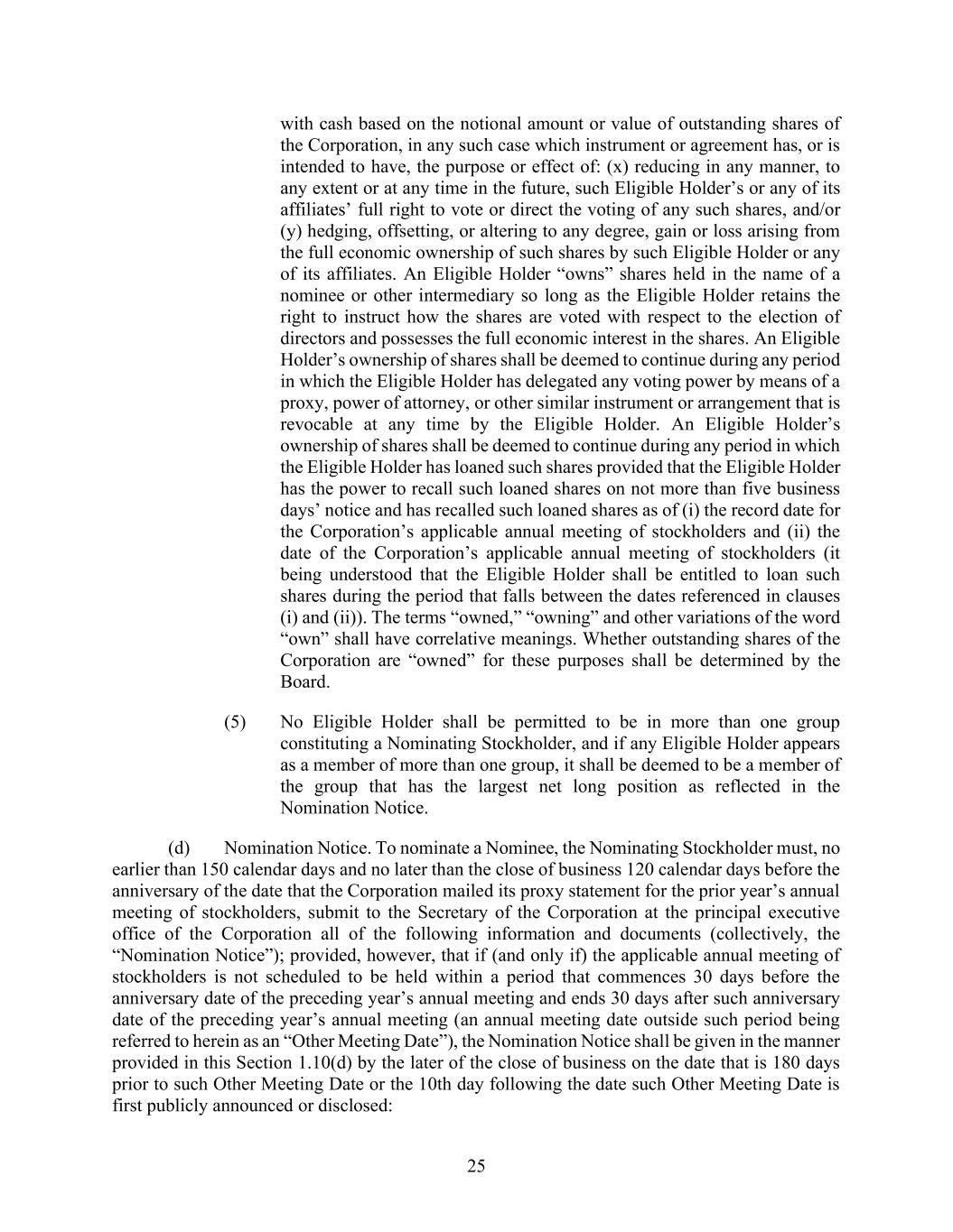 25 with cash based on the notional amount or value of outstanding shares of the Corporation, in any such case which instrument or agreement has, or is intended to have, the purpose or effect of: (x) reducing in any manner, to any extent or at any time in the future, such Eligible Holder’s or any of its affiliates’ full right to vote or direct the voting of any such shares, and/or (y) hedging, offsetting, or altering to any degree, gain or loss arising from the full economic ownership of such shares by such Eligible Holder or any of its affiliates. An Eligible Holder “owns” shares held in the name of a nominee or other intermediary so long as the Eligible Holder retains the right to instruct how the shares are voted with respect to the election of directors and possesses the full economic interest in the shares. An Eligible Holder’s ownership of shares shall be deemed to continue during any period in which the Eligible Holder has delegated any voting power by means of a proxy, power of attorney, or other similar instrument or arrangement that is revocable at any time by the Eligible Holder. An Eligible Holder’s ownership of shares shall be deemed to continue during any period in which the Eligible Holder has loaned such shares provided that the Eligible Holder has the power to recall such loaned shares on not more than five business days’ notice and has recalled such loaned shares as of (i) the record date for the Corporation’s applicable annual meeting of stockholders and (ii) the date of the Corporation’s applicable annual meeting of stockholders (it being understood that the Eligible Holder shall be entitled to loan such shares during the period that falls between the dates referenced in clauses (i) and (ii)). The terms “owned,” “owning” and other variations of the word “own” shall have correlative meanings. Whether outstanding shares of the Corporation are “owned” for these purposes shall be determined by the Board. (5) No Eligible Holder shall be permitted to be in more than one group constituting a Nominating Stockholder, and if any Eligible Holder appears as a member of more than one group, it shall be deemed to be a member of the group that has the largest net long position as reflected in the Nomination Notice. (d) Nomination Notice. To nominate a Nominee, the Nominating Stockholder must, no earlier than 150 calendar days and no later than the close of business 120 calendar days before the anniversary of the date that the Corporation mailed its proxy statement for the prior year’s annual meeting of stockholders, submit to the Secretary of the Corporation at the principal executive office of the Corporation all of the following information and documents (collectively, the “Nomination Notice”); provided, however, that if (and only if) the applicable annual meeting of stockholders is not scheduled to be held within a period that commences 30 days before the anniversary date of the preceding year’s annual meeting and ends 30 days after such anniversary date of the preceding year’s annual meeting (an annual meeting date outside such period being referred to herein as an “Other Meeting Date”), the Nomination Notice shall be given in the manner provided in this Section 1.10(d) by the later of the close of business on the date that is 180 days prior to such Other Meeting Date or the 10th day following the date such Other Meeting Date is first publicly announced or disclosed: