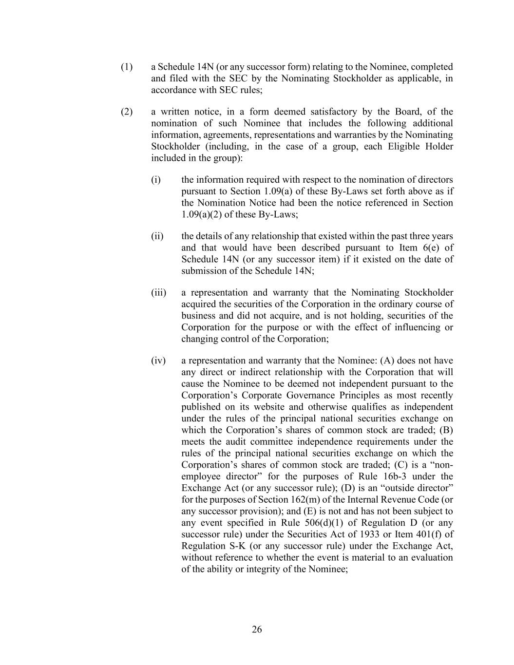 26 (1) a Schedule 14N (or any successor form) relating to the Nominee, completed and filed with the SEC by the Nominating Stockholder as applicable, in accordance with SEC rules; (2) a written notice, in a form deemed satisfactory by the Board, of the nomination of such Nominee that includes the following additional information, agreements, representations and warranties by the Nominating Stockholder (including, in the case of a group, each Eligible Holder included in the group): (i) the information required with respect to the nomination of directors pursuant to Section 1.09(a) of these By-Laws set forth above as if the Nomination Notice had been the notice referenced in Section 1.09(a)(2) of these By-Laws; (ii) the details of any relationship that existed within the past three years and that would have been described pursuant to Item 6(e) of Schedule 14N (or any successor item) if it existed on the date of submission of the Schedule 14N; (iii) a representation and warranty that the Nominating Stockholder acquired the securities of the Corporation in the ordinary course of business and did not acquire, and is not holding, securities of the Corporation for the purpose or with the effect of influencing or changing control of the Corporation; (iv) a representation and warranty that the Nominee: (A) does not have any direct or indirect relationship with the Corporation that will cause the Nominee to be deemed not independent pursuant to the Corporation’s Corporate Governance Principles as most recently published on its website and otherwise qualifies as independent under the rules of the principal national securities exchange on which the Corporation’s shares of common stock are traded; (B) meets the audit committee independence requirements under the rules of the principal national securities exchange on which the Corporation’s shares of common stock are traded; (C) is a “non- employee director” for the purposes of Rule 16b-3 under the Exchange Act (or any successor rule); (D) is an “outside director” for the purposes of Section 162(m) of the Internal Revenue Code (or any successor provision); and (E) is not and has not been subject to any event specified in Rule 506(d)(1) of Regulation D (or any successor rule) under the Securities Act of 1933 or Item 401(f) of Regulation S-K (or any successor rule) under the Exchange Act, without reference to whether the event is material to an evaluation of the ability or integrity of the Nominee;