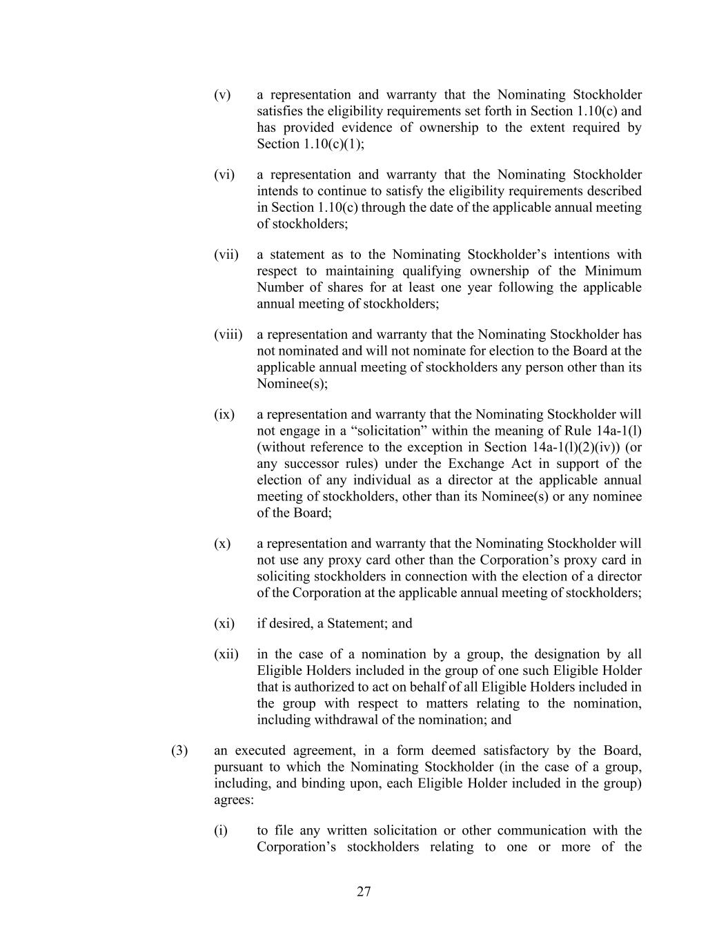 27 (v) a representation and warranty that the Nominating Stockholder satisfies the eligibility requirements set forth in Section 1.10(c) and has provided evidence of ownership to the extent required by Section 1.10(c)(1); (vi) a representation and warranty that the Nominating Stockholder intends to continue to satisfy the eligibility requirements described in Section 1.10(c) through the date of the applicable annual meeting of stockholders; (vii) a statement as to the Nominating Stockholder’s intentions with respect to maintaining qualifying ownership of the Minimum Number of shares for at least one year following the applicable annual meeting of stockholders; (viii) a representation and warranty that the Nominating Stockholder has not nominated and will not nominate for election to the Board at the applicable annual meeting of stockholders any person other than its Nominee(s); (ix) a representation and warranty that the Nominating Stockholder will not engage in a “solicitation” within the meaning of Rule 14a-1(l) (without reference to the exception in Section 14a-1(l)(2)(iv)) (or any successor rules) under the Exchange Act in support of the election of any individual as a director at the applicable annual meeting of stockholders, other than its Nominee(s) or any nominee of the Board; (x) a representation and warranty that the Nominating Stockholder will not use any proxy card other than the Corporation’s proxy card in soliciting stockholders in connection with the election of a director of the Corporation at the applicable annual meeting of stockholders; (xi) if desired, a Statement; and (xii) in the case of a nomination by a group, the designation by all Eligible Holders included in the group of one such Eligible Holder that is authorized to act on behalf of all Eligible Holders included in the group with respect to matters relating to the nomination, including withdrawal of the nomination; and (3) an executed agreement, in a form deemed satisfactory by the Board, pursuant to which the Nominating Stockholder (in the case of a group, including, and binding upon, each Eligible Holder included in the group) agrees: (i) to file any written solicitation or other communication with the Corporation’s stockholders relating to one or more of the