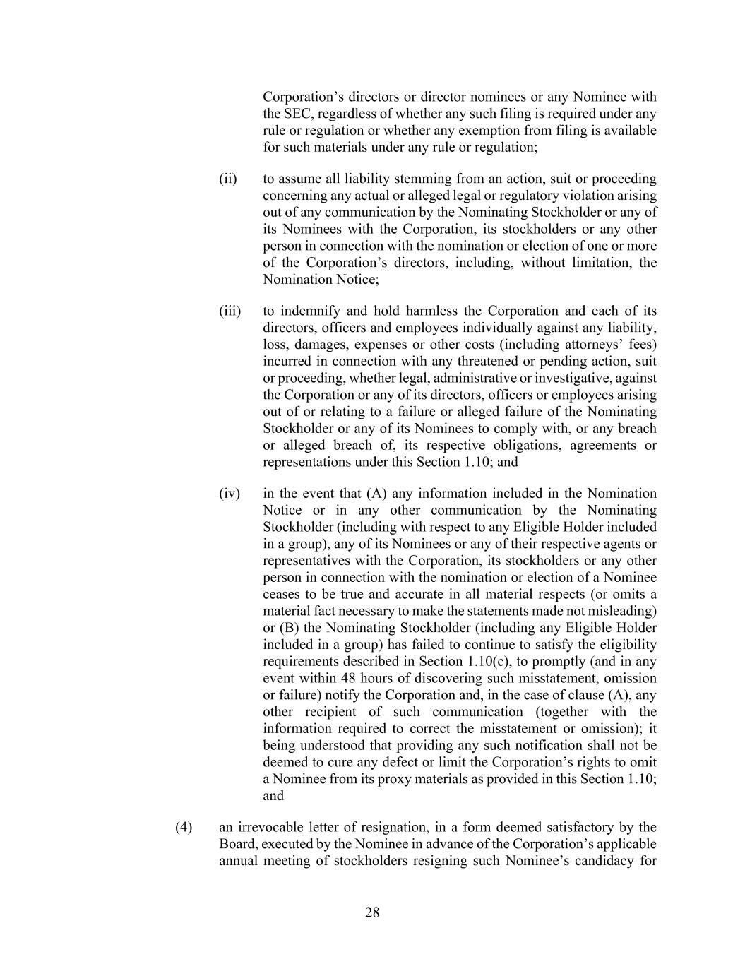 28 Corporation’s directors or director nominees or any Nominee with the SEC, regardless of whether any such filing is required under any rule or regulation or whether any exemption from filing is available for such materials under any rule or regulation; (ii) to assume all liability stemming from an action, suit or proceeding concerning any actual or alleged legal or regulatory violation arising out of any communication by the Nominating Stockholder or any of its Nominees with the Corporation, its stockholders or any other person in connection with the nomination or election of one or more of the Corporation’s directors, including, without limitation, the Nomination Notice; (iii) to indemnify and hold harmless the Corporation and each of its directors, officers and employees individually against any liability, loss, damages, expenses or other costs (including attorneys’ fees) incurred in connection with any threatened or pending action, suit or proceeding, whether legal, administrative or investigative, against the Corporation or any of its directors, officers or employees arising out of or relating to a failure or alleged failure of the Nominating Stockholder or any of its Nominees to comply with, or any breach or alleged breach of, its respective obligations, agreements or representations under this Section 1.10; and (iv) in the event that (A) any information included in the Nomination Notice or in any other communication by the Nominating Stockholder (including with respect to any Eligible Holder included in a group), any of its Nominees or any of their respective agents or representatives with the Corporation, its stockholders or any other person in connection with the nomination or election of a Nominee ceases to be true and accurate in all material respects (or omits a material fact necessary to make the statements made not misleading) or (B) the Nominating Stockholder (including any Eligible Holder included in a group) has failed to continue to satisfy the eligibility requirements described in Section 1.10(c), to promptly (and in any event within 48 hours of discovering such misstatement, omission or failure) notify the Corporation and, in the case of clause (A), any other recipient of such communication (together with the information required to correct the misstatement or omission); it being understood that providing any such notification shall not be deemed to cure any defect or limit the Corporation’s rights to omit a Nominee from its proxy materials as provided in this Section 1.10; and (4) an irrevocable letter of resignation, in a form deemed satisfactory by the Board, executed by the Nominee in advance of the Corporation’s applicable annual meeting of stockholders resigning such Nominee’s candidacy for