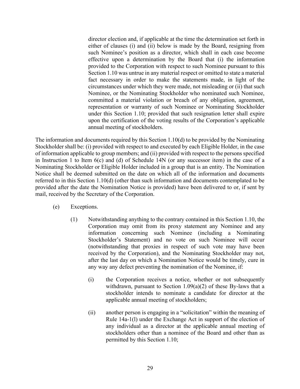 29 director election and, if applicable at the time the determination set forth in either of clauses (i) and (ii) below is made by the Board, resigning from such Nominee’s position as a director, which shall in each case become effective upon a determination by the Board that (i) the information provided to the Corporation with respect to such Nominee pursuant to this Section 1.10 was untrue in any material respect or omitted to state a material fact necessary in order to make the statements made, in light of the circumstances under which they were made, not misleading or (ii) that such Nominee, or the Nominating Stockholder who nominated such Nominee, committed a material violation or breach of any obligation, agreement, representation or warranty of such Nominee or Nominating Stockholder under this Section 1.10; provided that such resignation letter shall expire upon the certification of the voting results of the Corporation’s applicable annual meeting of stockholders. The information and documents required by this Section 1.10(d) to be provided by the Nominating Stockholder shall be: (i) provided with respect to and executed by each Eligible Holder, in the case of information applicable to group members; and (ii) provided with respect to the persons specified in Instruction 1 to Item 6(c) and (d) of Schedule 14N (or any successor item) in the case of a Nominating Stockholder or Eligible Holder included in a group that is an entity. The Nomination Notice shall be deemed submitted on the date on which all of the information and documents referred to in this Section 1.10(d) (other than such information and documents contemplated to be provided after the date the Nomination Notice is provided) have been delivered to or, if sent by mail, received by the Secretary of the Corporation. (e) Exceptions. (1) Notwithstanding anything to the contrary contained in this Section 1.10, the Corporation may omit from its proxy statement any Nominee and any information concerning such Nominee (including a Nominating Stockholder’s Statement) and no vote on such Nominee will occur (notwithstanding that proxies in respect of such vote may have been received by the Corporation), and the Nominating Stockholder may not, after the last day on which a Nomination Notice would be timely, cure in any way any defect preventing the nomination of the Nominee, if: (i) the Corporation receives a notice, whether or not subsequently withdrawn, pursuant to Section 1.09(a)(2) of these By-laws that a stockholder intends to nominate a candidate for director at the applicable annual meeting of stockholders; (ii) another person is engaging in a “solicitation” within the meaning of Rule 14a-1(l) under the Exchange Act in support of the election of any individual as a director at the applicable annual meeting of stockholders other than a nominee of the Board and other than as permitted by this Section 1.10;
