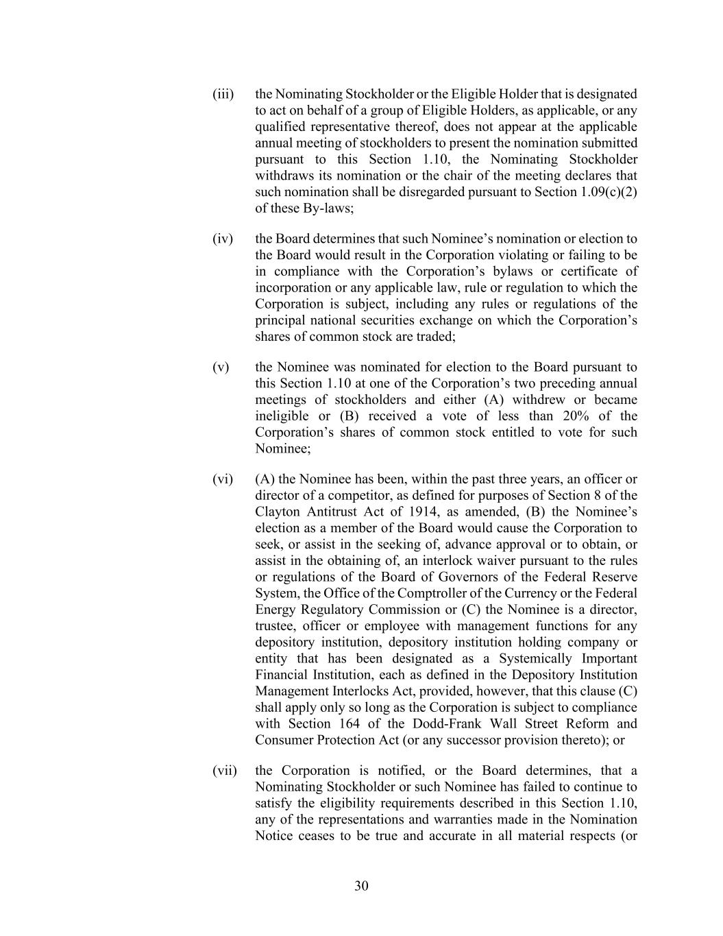 30 (iii) the Nominating Stockholder or the Eligible Holder that is designated to act on behalf of a group of Eligible Holders, as applicable, or any qualified representative thereof, does not appear at the applicable annual meeting of stockholders to present the nomination submitted pursuant to this Section 1.10, the Nominating Stockholder withdraws its nomination or the chair of the meeting declares that such nomination shall be disregarded pursuant to Section 1.09(c)(2) of these By-laws; (iv) the Board determines that such Nominee’s nomination or election to the Board would result in the Corporation violating or failing to be in compliance with the Corporation’s bylaws or certificate of incorporation or any applicable law, rule or regulation to which the Corporation is subject, including any rules or regulations of the principal national securities exchange on which the Corporation’s shares of common stock are traded; (v) the Nominee was nominated for election to the Board pursuant to this Section 1.10 at one of the Corporation’s two preceding annual meetings of stockholders and either (A) withdrew or became ineligible or (B) received a vote of less than 20% of the Corporation’s shares of common stock entitled to vote for such Nominee; (vi) (A) the Nominee has been, within the past three years, an officer or director of a competitor, as defined for purposes of Section 8 of the Clayton Antitrust Act of 1914, as amended, (B) the Nominee’s election as a member of the Board would cause the Corporation to seek, or assist in the seeking of, advance approval or to obtain, or assist in the obtaining of, an interlock waiver pursuant to the rules or regulations of the Board of Governors of the Federal Reserve System, the Office of the Comptroller of the Currency or the Federal Energy Regulatory Commission or (C) the Nominee is a director, trustee, officer or employee with management functions for any depository institution, depository institution holding company or entity that has been designated as a Systemically Important Financial Institution, each as defined in the Depository Institution Management Interlocks Act, provided, however, that this clause (C) shall apply only so long as the Corporation is subject to compliance with Section 164 of the Dodd-Frank Wall Street Reform and Consumer Protection Act (or any successor provision thereto); or (vii) the Corporation is notified, or the Board determines, that a Nominating Stockholder or such Nominee has failed to continue to satisfy the eligibility requirements described in this Section 1.10, any of the representations and warranties made in the Nomination Notice ceases to be true and accurate in all material respects (or