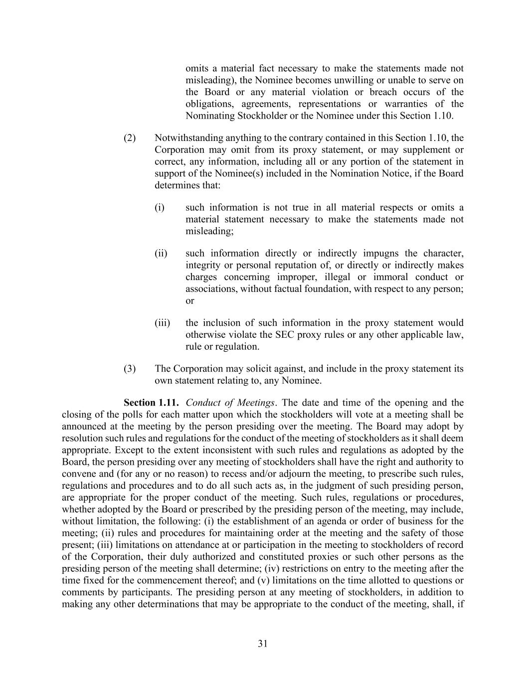 31 omits a material fact necessary to make the statements made not misleading), the Nominee becomes unwilling or unable to serve on the Board or any material violation or breach occurs of the obligations, agreements, representations or warranties of the Nominating Stockholder or the Nominee under this Section 1.10. (2) Notwithstanding anything to the contrary contained in this Section 1.10, the Corporation may omit from its proxy statement, or may supplement or correct, any information, including all or any portion of the statement in support of the Nominee(s) included in the Nomination Notice, if the Board determines that: (i) such information is not true in all material respects or omits a material statement necessary to make the statements made not misleading; (ii) such information directly or indirectly impugns the character, integrity or personal reputation of, or directly or indirectly makes charges concerning improper, illegal or immoral conduct or associations, without factual foundation, with respect to any person; or (iii) the inclusion of such information in the proxy statement would otherwise violate the SEC proxy rules or any other applicable law, rule or regulation. (3) The Corporation may solicit against, and include in the proxy statement its own statement relating to, any Nominee. Section 1.11. Conduct of Meetings. The date and time of the opening and the closing of the polls for each matter upon which the stockholders will vote at a meeting shall be announced at the meeting by the person presiding over the meeting. The Board may adopt by resolution such rules and regulations for the conduct of the meeting of stockholders as it shall deem appropriate. Except to the extent inconsistent with such rules and regulations as adopted by the Board, the person presiding over any meeting of stockholders shall have the right and authority to convene and (for any or no reason) to recess and/or adjourn the meeting, to prescribe such rules, regulations and procedures and to do all such acts as, in the judgment of such presiding person, are appropriate for the proper conduct of the meeting. Such rules, regulations or procedures, whether adopted by the Board or prescribed by the presiding person of the meeting, may include, without limitation, the following: (i) the establishment of an agenda or order of business for the meeting; (ii) rules and procedures for maintaining order at the meeting and the safety of those present; (iii) limitations on attendance at or participation in the meeting to stockholders of record of the Corporation, their duly authorized and constituted proxies or such other persons as the presiding person of the meeting shall determine; (iv) restrictions on entry to the meeting after the time fixed for the commencement thereof; and (v) limitations on the time allotted to questions or comments by participants. The presiding person at any meeting of stockholders, in addition to making any other determinations that may be appropriate to the conduct of the meeting, shall, if