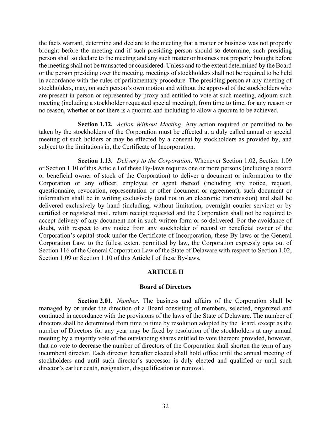 32 the facts warrant, determine and declare to the meeting that a matter or business was not properly brought before the meeting and if such presiding person should so determine, such presiding person shall so declare to the meeting and any such matter or business not properly brought before the meeting shall not be transacted or considered. Unless and to the extent determined by the Board or the person presiding over the meeting, meetings of stockholders shall not be required to be held in accordance with the rules of parliamentary procedure. The presiding person at any meeting of stockholders, may, on such person’s own motion and without the approval of the stockholders who are present in person or represented by proxy and entitled to vote at such meeting, adjourn such meeting (including a stockholder requested special meeting), from time to time, for any reason or no reason, whether or not there is a quorum and including to allow a quorum to be achieved. Section 1.12. Action Without Meeting. Any action required or permitted to be taken by the stockholders of the Corporation must be effected at a duly called annual or special meeting of such holders or may be effected by a consent by stockholders as provided by, and subject to the limitations in, the Certificate of Incorporation. Section 1.13. Delivery to the Corporation. Whenever Section 1.02, Section 1.09 or Section 1.10 of this Article I of these By-laws requires one or more persons (including a record or beneficial owner of stock of the Corporation) to deliver a document or information to the Corporation or any officer, employee or agent thereof (including any notice, request, questionnaire, revocation, representation or other document or agreement), such document or information shall be in writing exclusively (and not in an electronic transmission) and shall be delivered exclusively by hand (including, without limitation, overnight courier service) or by certified or registered mail, return receipt requested and the Corporation shall not be required to accept delivery of any document not in such written form or so delivered. For the avoidance of doubt, with respect to any notice from any stockholder of record or beneficial owner of the Corporation’s capital stock under the Certificate of Incorporation, these By-laws or the General Corporation Law, to the fullest extent permitted by law, the Corporation expressly opts out of Section 116 of the General Corporation Law of the State of Delaware with respect to Section 1.02, Section 1.09 or Section 1.10 of this Article I of these By-laws. ARTICLE II Board of Directors Section 2.01. Number. The business and affairs of the Corporation shall be managed by or under the direction of a Board consisting of members, selected, organized and continued in accordance with the provisions of the laws of the State of Delaware. The number of directors shall be determined from time to time by resolution adopted by the Board, except as the number of Directors for any year may be fixed by resolution of the stockholders at any annual meeting by a majority vote of the outstanding shares entitled to vote thereon; provided, however, that no vote to decrease the number of directors of the Corporation shall shorten the term of any incumbent director. Each director hereafter elected shall hold office until the annual meeting of stockholders and until such director’s successor is duly elected and qualified or until such director’s earlier death, resignation, disqualification or removal.
