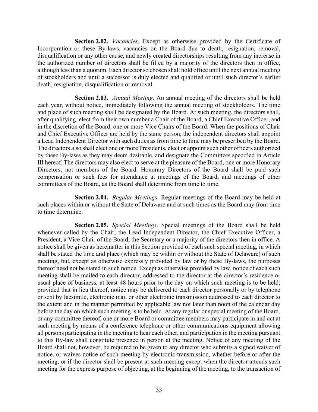 33 Section 2.02. Vacancies. Except as otherwise provided by the Certificate of Incorporation or these By-laws, vacancies on the Board due to death, resignation, removal, disqualification or any other cause, and newly created directorships resulting from any increase in the authorized number of directors shall be filled by a majority of the directors then in office, although less than a quorum. Each director so chosen shall hold office until the next annual meeting of stockholders and until a successor is duly elected and qualified or until such director’s earlier death, resignation, disqualification or removal. Section 2.03. Annual Meeting. An annual meeting of the directors shall be held each year, without notice, immediately following the annual meeting of stockholders. The time and place of such meeting shall be designated by the Board. At such meeting, the directors shall, after qualifying, elect from their own number a Chair of the Board, a Chief Executive Officer, and in the discretion of the Board, one or more Vice Chairs of the Board. When the positions of Chair and Chief Executive Officer are held by the same person, the independent directors shall appoint a Lead Independent Director with such duties as from time to time may be prescribed by the Board. The directors also shall elect one or more Presidents, elect or appoint such other officers authorized by these By-laws as they may deem desirable, and designate the Committees specified in Article III hereof. The directors may also elect to serve at the pleasure of the Board, one or more Honorary Directors, not members of the Board. Honorary Directors of the Board shall be paid such compensation or such fees for attendance at meetings of the Board, and meetings of other committees of the Board, as the Board shall determine from time to time. Section 2.04. Regular Meetings. Regular meetings of the Board may be held at such places within or without the State of Delaware and at such times as the Board may from time to time determine. Section 2.05. Special Meetings. Special meetings of the Board shall be held whenever called by the Chair, the Lead Independent Director, the Chief Executive Officer, a President, a Vice Chair of the Board, the Secretary or a majority of the directors then in office. A notice shall be given as hereinafter in this Section provided of each such special meeting, in which shall be stated the time and place (which may be within or without the State of Delaware) of such meeting, but, except as otherwise expressly provided by law or by these By-laws, the purposes thereof need not be stated in such notice. Except as otherwise provided by law, notice of each such meeting shall be mailed to each director, addressed to the director at the director’s residence or usual place of business, at least 48 hours prior to the day on which such meeting is to be held; provided that in lieu thereof, notice may be delivered to each director personally or by telephone or sent by facsimile, electronic mail or other electronic transmission addressed to each director to the extent and in the manner permitted by applicable law not later than noon of the calendar day before the day on which such meeting is to be held. At any regular or special meeting of the Board, or any committee thereof, one or more Board or committee members may participate in and act at such meeting by means of a conference telephone or other communications equipment allowing all persons participating in the meeting to hear each other, and participation in the meeting pursuant to this By-law shall constitute presence in person at the meeting. Notice of any meeting of the Board shall not, however, be required to be given to any director who submits a signed waiver of notice, or waives notice of such meeting by electronic transmission, whether before or after the meeting, or if the director shall be present at such meeting except when the director attends such meeting for the express purpose of objecting, at the beginning of the meeting, to the transaction of