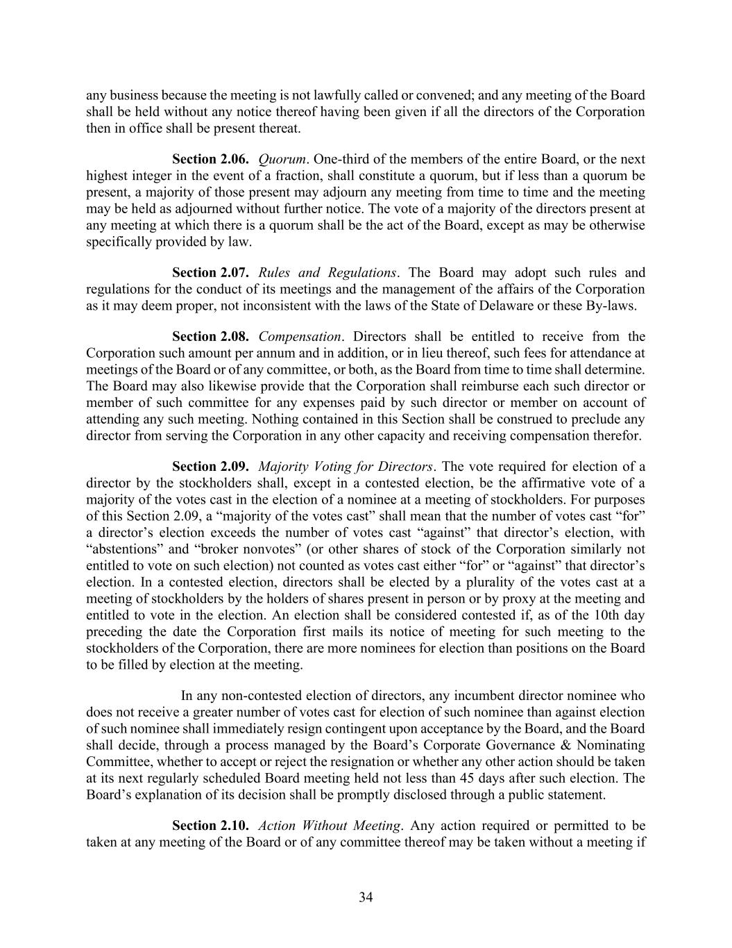 34 any business because the meeting is not lawfully called or convened; and any meeting of the Board shall be held without any notice thereof having been given if all the directors of the Corporation then in office shall be present thereat. Section 2.06. Quorum. One-third of the members of the entire Board, or the next highest integer in the event of a fraction, shall constitute a quorum, but if less than a quorum be present, a majority of those present may adjourn any meeting from time to time and the meeting may be held as adjourned without further notice. The vote of a majority of the directors present at any meeting at which there is a quorum shall be the act of the Board, except as may be otherwise specifically provided by law. Section 2.07. Rules and Regulations. The Board may adopt such rules and regulations for the conduct of its meetings and the management of the affairs of the Corporation as it may deem proper, not inconsistent with the laws of the State of Delaware or these By-laws. Section 2.08. Compensation. Directors shall be entitled to receive from the Corporation such amount per annum and in addition, or in lieu thereof, such fees for attendance at meetings of the Board or of any committee, or both, as the Board from time to time shall determine. The Board may also likewise provide that the Corporation shall reimburse each such director or member of such committee for any expenses paid by such director or member on account of attending any such meeting. Nothing contained in this Section shall be construed to preclude any director from serving the Corporation in any other capacity and receiving compensation therefor. Section 2.09. Majority Voting for Directors. The vote required for election of a director by the stockholders shall, except in a contested election, be the affirmative vote of a majority of the votes cast in the election of a nominee at a meeting of stockholders. For purposes of this Section 2.09, a “majority of the votes cast” shall mean that the number of votes cast “for” a director’s election exceeds the number of votes cast “against” that director’s election, with “abstentions” and “broker nonvotes” (or other shares of stock of the Corporation similarly not entitled to vote on such election) not counted as votes cast either “for” or “against” that director’s election. In a contested election, directors shall be elected by a plurality of the votes cast at a meeting of stockholders by the holders of shares present in person or by proxy at the meeting and entitled to vote in the election. An election shall be considered contested if, as of the 10th day preceding the date the Corporation first mails its notice of meeting for such meeting to the stockholders of the Corporation, there are more nominees for election than positions on the Board to be filled by election at the meeting. In any non-contested election of directors, any incumbent director nominee who does not receive a greater number of votes cast for election of such nominee than against election of such nominee shall immediately resign contingent upon acceptance by the Board, and the Board shall decide, through a process managed by the Board’s Corporate Governance & Nominating Committee, whether to accept or reject the resignation or whether any other action should be taken at its next regularly scheduled Board meeting held not less than 45 days after such election. The Board’s explanation of its decision shall be promptly disclosed through a public statement. Section 2.10. Action Without Meeting. Any action required or permitted to be taken at any meeting of the Board or of any committee thereof may be taken without a meeting if