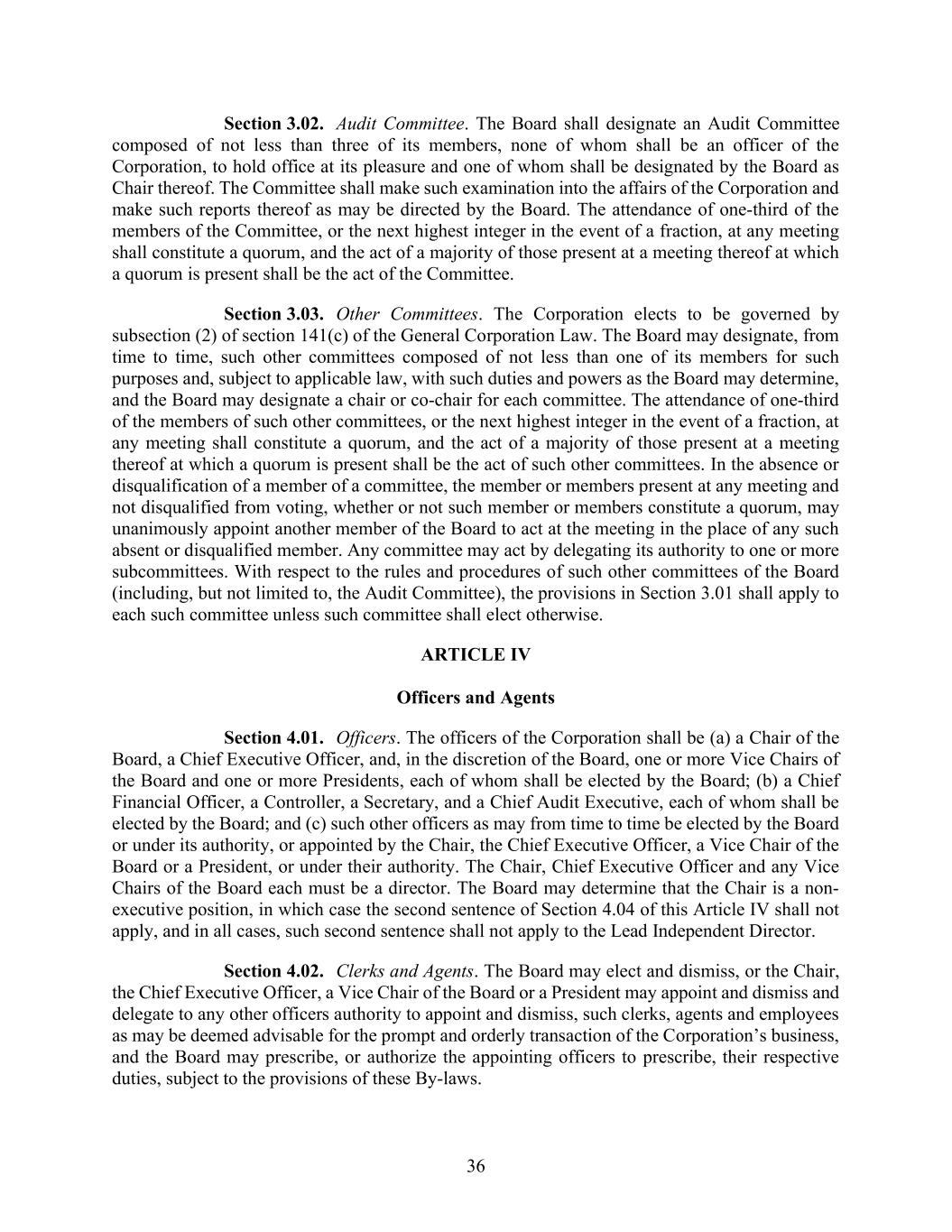 36 Section 3.02. Audit Committee. The Board shall designate an Audit Committee composed of not less than three of its members, none of whom shall be an officer of the Corporation, to hold office at its pleasure and one of whom shall be designated by the Board as Chair thereof. The Committee shall make such examination into the affairs of the Corporation and make such reports thereof as may be directed by the Board. The attendance of one-third of the members of the Committee, or the next highest integer in the event of a fraction, at any meeting shall constitute a quorum, and the act of a majority of those present at a meeting thereof at which a quorum is present shall be the act of the Committee. Section 3.03. Other Committees. The Corporation elects to be governed by subsection (2) of section 141(c) of the General Corporation Law. The Board may designate, from time to time, such other committees composed of not less than one of its members for such purposes and, subject to applicable law, with such duties and powers as the Board may determine, and the Board may designate a chair or co-chair for each committee. The attendance of one-third of the members of such other committees, or the next highest integer in the event of a fraction, at any meeting shall constitute a quorum, and the act of a majority of those present at a meeting thereof at which a quorum is present shall be the act of such other committees. In the absence or disqualification of a member of a committee, the member or members present at any meeting and not disqualified from voting, whether or not such member or members constitute a quorum, may unanimously appoint another member of the Board to act at the meeting in the place of any such absent or disqualified member. Any committee may act by delegating its authority to one or more subcommittees. With respect to the rules and procedures of such other committees of the Board (including, but not limited to, the Audit Committee), the provisions in Section 3.01 shall apply to each such committee unless such committee shall elect otherwise. ARTICLE IV Officers and Agents Section 4.01. Officers. The officers of the Corporation shall be (a) a Chair of the Board, a Chief Executive Officer, and, in the discretion of the Board, one or more Vice Chairs of the Board and one or more Presidents, each of whom shall be elected by the Board; (b) a Chief Financial Officer, a Controller, a Secretary, and a Chief Audit Executive, each of whom shall be elected by the Board; and (c) such other officers as may from time to time be elected by the Board or under its authority, or appointed by the Chair, the Chief Executive Officer, a Vice Chair of the Board or a President, or under their authority. The Chair, Chief Executive Officer and any Vice Chairs of the Board each must be a director. The Board may determine that the Chair is a non- executive position, in which case the second sentence of Section 4.04 of this Article IV shall not apply, and in all cases, such second sentence shall not apply to the Lead Independent Director. Section 4.02. Clerks and Agents. The Board may elect and dismiss, or the Chair, the Chief Executive Officer, a Vice Chair of the Board or a President may appoint and dismiss and delegate to any other officers authority to appoint and dismiss, such clerks, agents and employees as may be deemed advisable for the prompt and orderly transaction of the Corporation’s business, and the Board may prescribe, or authorize the appointing officers to prescribe, their respective duties, subject to the provisions of these By-laws.