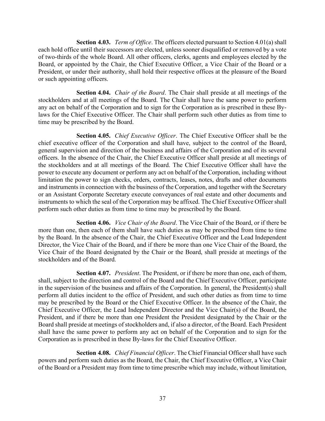 37 Section 4.03. Term of Office. The officers elected pursuant to Section 4.01(a) shall each hold office until their successors are elected, unless sooner disqualified or removed by a vote of two-thirds of the whole Board. All other officers, clerks, agents and employees elected by the Board, or appointed by the Chair, the Chief Executive Officer, a Vice Chair of the Board or a President, or under their authority, shall hold their respective offices at the pleasure of the Board or such appointing officers. Section 4.04. Chair of the Board. The Chair shall preside at all meetings of the stockholders and at all meetings of the Board. The Chair shall have the same power to perform any act on behalf of the Corporation and to sign for the Corporation as is prescribed in these By- laws for the Chief Executive Officer. The Chair shall perform such other duties as from time to time may be prescribed by the Board. Section 4.05. Chief Executive Officer. The Chief Executive Officer shall be the chief executive officer of the Corporation and shall have, subject to the control of the Board, general supervision and direction of the business and affairs of the Corporation and of its several officers. In the absence of the Chair, the Chief Executive Officer shall preside at all meetings of the stockholders and at all meetings of the Board. The Chief Executive Officer shall have the power to execute any document or perform any act on behalf of the Corporation, including without limitation the power to sign checks, orders, contracts, leases, notes, drafts and other documents and instruments in connection with the business of the Corporation, and together with the Secretary or an Assistant Corporate Secretary execute conveyances of real estate and other documents and instruments to which the seal of the Corporation may be affixed. The Chief Executive Officer shall perform such other duties as from time to time may be prescribed by the Board. Section 4.06. Vice Chair of the Board. The Vice Chair of the Board, or if there be more than one, then each of them shall have such duties as may be prescribed from time to time by the Board. In the absence of the Chair, the Chief Executive Officer and the Lead Independent Director, the Vice Chair of the Board, and if there be more than one Vice Chair of the Board, the Vice Chair of the Board designated by the Chair or the Board, shall preside at meetings of the stockholders and of the Board. Section 4.07. President. The President, or if there be more than one, each of them, shall, subject to the direction and control of the Board and the Chief Executive Officer, participate in the supervision of the business and affairs of the Corporation. In general, the President(s) shall perform all duties incident to the office of President, and such other duties as from time to time may be prescribed by the Board or the Chief Executive Officer. In the absence of the Chair, the Chief Executive Officer, the Lead Independent Director and the Vice Chair(s) of the Board, the President, and if there be more than one President the President designated by the Chair or the Board shall preside at meetings of stockholders and, if also a director, of the Board. Each President shall have the same power to perform any act on behalf of the Corporation and to sign for the Corporation as is prescribed in these By-laws for the Chief Executive Officer. Section 4.08. Chief Financial Officer. The Chief Financial Officer shall have such powers and perform such duties as the Board, the Chair, the Chief Executive Officer, a Vice Chair of the Board or a President may from time to time prescribe which may include, without limitation,