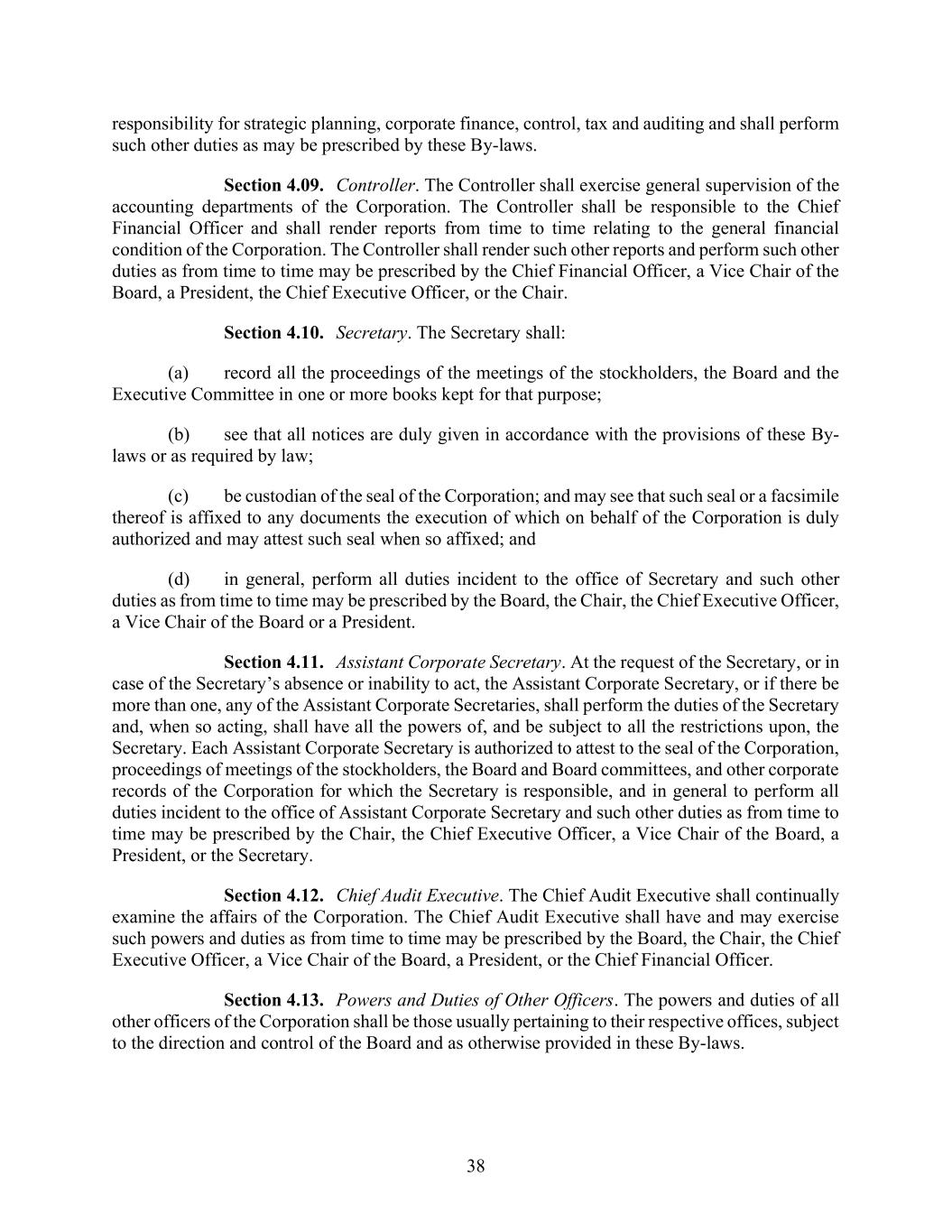 38 responsibility for strategic planning, corporate finance, control, tax and auditing and shall perform such other duties as may be prescribed by these By-laws. Section 4.09. Controller. The Controller shall exercise general supervision of the accounting departments of the Corporation. The Controller shall be responsible to the Chief Financial Officer and shall render reports from time to time relating to the general financial condition of the Corporation. The Controller shall render such other reports and perform such other duties as from time to time may be prescribed by the Chief Financial Officer, a Vice Chair of the Board, a President, the Chief Executive Officer, or the Chair. Section 4.10. Secretary. The Secretary shall: (a) record all the proceedings of the meetings of the stockholders, the Board and the Executive Committee in one or more books kept for that purpose; (b) see that all notices are duly given in accordance with the provisions of these By- laws or as required by law; (c) be custodian of the seal of the Corporation; and may see that such seal or a facsimile thereof is affixed to any documents the execution of which on behalf of the Corporation is duly authorized and may attest such seal when so affixed; and (d) in general, perform all duties incident to the office of Secretary and such other duties as from time to time may be prescribed by the Board, the Chair, the Chief Executive Officer, a Vice Chair of the Board or a President. Section 4.11. Assistant Corporate Secretary. At the request of the Secretary, or in case of the Secretary’s absence or inability to act, the Assistant Corporate Secretary, or if there be more than one, any of the Assistant Corporate Secretaries, shall perform the duties of the Secretary and, when so acting, shall have all the powers of, and be subject to all the restrictions upon, the Secretary. Each Assistant Corporate Secretary is authorized to attest to the seal of the Corporation, proceedings of meetings of the stockholders, the Board and Board committees, and other corporate records of the Corporation for which the Secretary is responsible, and in general to perform all duties incident to the office of Assistant Corporate Secretary and such other duties as from time to time may be prescribed by the Chair, the Chief Executive Officer, a Vice Chair of the Board, a President, or the Secretary. Section 4.12. Chief Audit Executive. The Chief Audit Executive shall continually examine the affairs of the Corporation. The Chief Audit Executive shall have and may exercise such powers and duties as from time to time may be prescribed by the Board, the Chair, the Chief Executive Officer, a Vice Chair of the Board, a President, or the Chief Financial Officer. Section 4.13. Powers and Duties of Other Officers. The powers and duties of all other officers of the Corporation shall be those usually pertaining to their respective offices, subject to the direction and control of the Board and as otherwise provided in these By-laws.