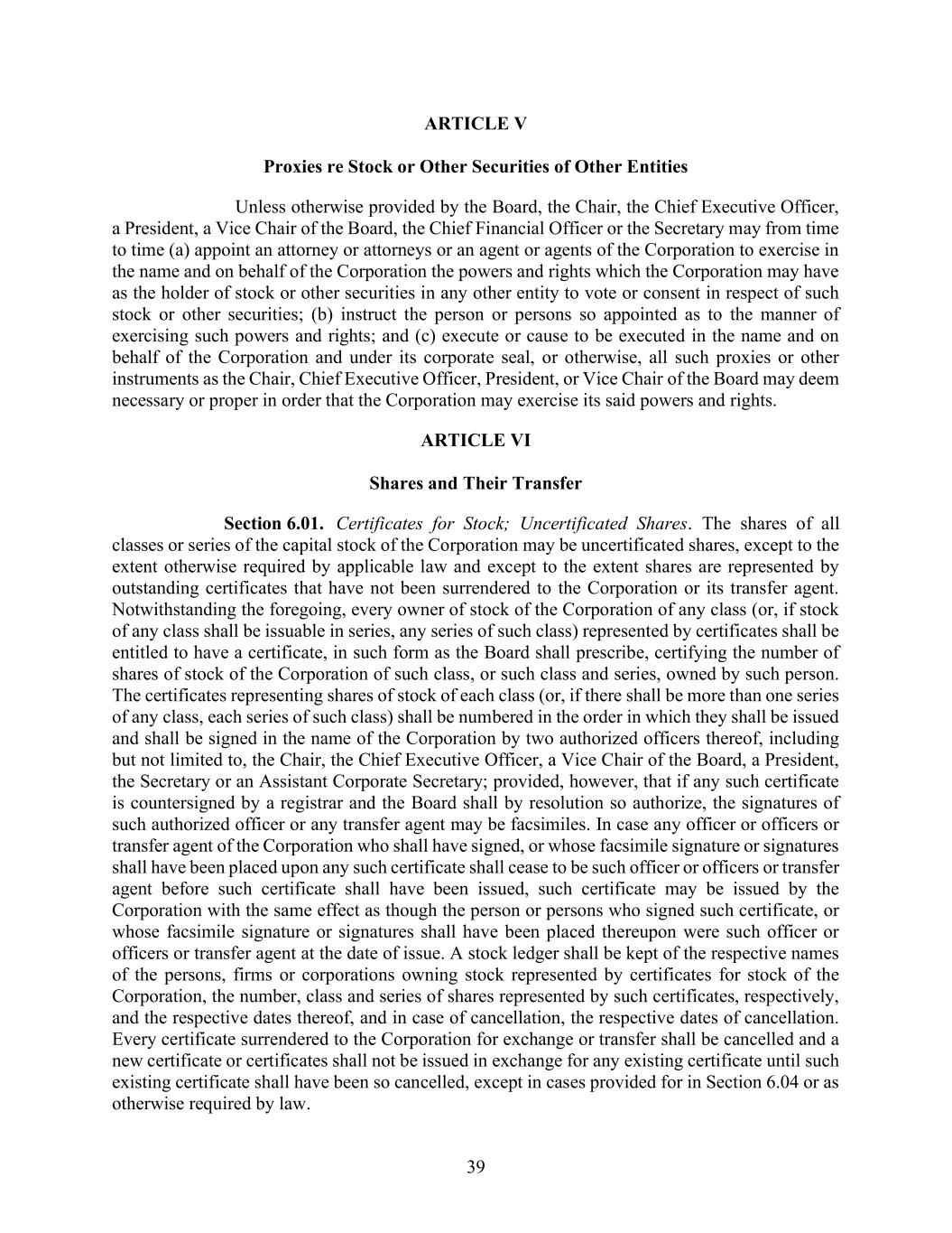 39 ARTICLE V Proxies re Stock or Other Securities of Other Entities Unless otherwise provided by the Board, the Chair, the Chief Executive Officer, a President, a Vice Chair of the Board, the Chief Financial Officer or the Secretary may from time to time (a) appoint an attorney or attorneys or an agent or agents of the Corporation to exercise in the name and on behalf of the Corporation the powers and rights which the Corporation may have as the holder of stock or other securities in any other entity to vote or consent in respect of such stock or other securities; (b) instruct the person or persons so appointed as to the manner of exercising such powers and rights; and (c) execute or cause to be executed in the name and on behalf of the Corporation and under its corporate seal, or otherwise, all such proxies or other instruments as the Chair, Chief Executive Officer, President, or Vice Chair of the Board may deem necessary or proper in order that the Corporation may exercise its said powers and rights. ARTICLE VI Shares and Their Transfer Section 6.01. Certificates for Stock; Uncertificated Shares. The shares of all classes or series of the capital stock of the Corporation may be uncertificated shares, except to the extent otherwise required by applicable law and except to the extent shares are represented by outstanding certificates that have not been surrendered to the Corporation or its transfer agent. Notwithstanding the foregoing, every owner of stock of the Corporation of any class (or, if stock of any class shall be issuable in series, any series of such class) represented by certificates shall be entitled to have a certificate, in such form as the Board shall prescribe, certifying the number of shares of stock of the Corporation of such class, or such class and series, owned by such person. The certificates representing shares of stock of each class (or, if there shall be more than one series of any class, each series of such class) shall be numbered in the order in which they shall be issued and shall be signed in the name of the Corporation by two authorized officers thereof, including but not limited to, the Chair, the Chief Executive Officer, a Vice Chair of the Board, a President, the Secretary or an Assistant Corporate Secretary; provided, however, that if any such certificate is countersigned by a registrar and the Board shall by resolution so authorize, the signatures of such authorized officer or any transfer agent may be facsimiles. In case any officer or officers or transfer agent of the Corporation who shall have signed, or whose facsimile signature or signatures shall have been placed upon any such certificate shall cease to be such officer or officers or transfer agent before such certificate shall have been issued, such certificate may be issued by the Corporation with the same effect as though the person or persons who signed such certificate, or whose facsimile signature or signatures shall have been placed thereupon were such officer or officers or transfer agent at the date of issue. A stock ledger shall be kept of the respective names of the persons, firms or corporations owning stock represented by certificates for stock of the Corporation, the number, class and series of shares represented by such certificates, respectively, and the respective dates thereof, and in case of cancellation, the respective dates of cancellation. Every certificate surrendered to the Corporation for exchange or transfer shall be cancelled and a new certificate or certificates shall not be issued in exchange for any existing certificate until such existing certificate shall have been so cancelled, except in cases provided for in Section 6.04 or as otherwise required by law.