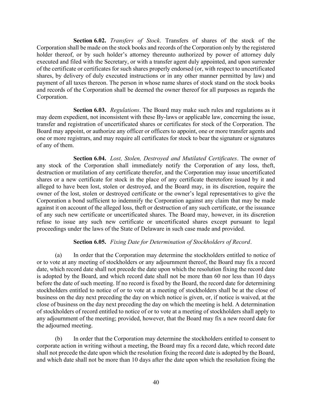 40 Section 6.02. Transfers of Stock. Transfers of shares of the stock of the Corporation shall be made on the stock books and records of the Corporation only by the registered holder thereof, or by such holder’s attorney thereunto authorized by power of attorney duly executed and filed with the Secretary, or with a transfer agent duly appointed, and upon surrender of the certificate or certificates for such shares properly endorsed (or, with respect to uncertificated shares, by delivery of duly executed instructions or in any other manner permitted by law) and payment of all taxes thereon. The person in whose name shares of stock stand on the stock books and records of the Corporation shall be deemed the owner thereof for all purposes as regards the Corporation. Section 6.03. Regulations. The Board may make such rules and regulations as it may deem expedient, not inconsistent with these By-laws or applicable law, concerning the issue, transfer and registration of uncertificated shares or certificates for stock of the Corporation. The Board may appoint, or authorize any officer or officers to appoint, one or more transfer agents and one or more registrars, and may require all certificates for stock to bear the signature or signatures of any of them. Section 6.04. Lost, Stolen, Destroyed and Mutilated Certificates. The owner of any stock of the Corporation shall immediately notify the Corporation of any loss, theft, destruction or mutilation of any certificate therefor, and the Corporation may issue uncertificated shares or a new certificate for stock in the place of any certificate theretofore issued by it and alleged to have been lost, stolen or destroyed, and the Board may, in its discretion, require the owner of the lost, stolen or destroyed certificate or the owner’s legal representatives to give the Corporation a bond sufficient to indemnify the Corporation against any claim that may be made against it on account of the alleged loss, theft or destruction of any such certificate, or the issuance of any such new certificate or uncertificated shares. The Board may, however, in its discretion refuse to issue any such new certificate or uncertificated shares except pursuant to legal proceedings under the laws of the State of Delaware in such case made and provided. Section 6.05. Fixing Date for Determination of Stockholders of Record. (a) In order that the Corporation may determine the stockholders entitled to notice of or to vote at any meeting of stockholders or any adjournment thereof, the Board may fix a record date, which record date shall not precede the date upon which the resolution fixing the record date is adopted by the Board, and which record date shall not be more than 60 nor less than 10 days before the date of such meeting. If no record is fixed by the Board, the record date for determining stockholders entitled to notice of or to vote at a meeting of stockholders shall be at the close of business on the day next preceding the day on which notice is given, or, if notice is waived, at the close of business on the day next preceding the day on which the meeting is held. A determination of stockholders of record entitled to notice of or to vote at a meeting of stockholders shall apply to any adjournment of the meeting; provided, however, that the Board may fix a new record date for the adjourned meeting. (b) In order that the Corporation may determine the stockholders entitled to consent to corporate action in writing without a meeting, the Board may fix a record date, which record date shall not precede the date upon which the resolution fixing the record date is adopted by the Board, and which date shall not be more than 10 days after the date upon which the resolution fixing the