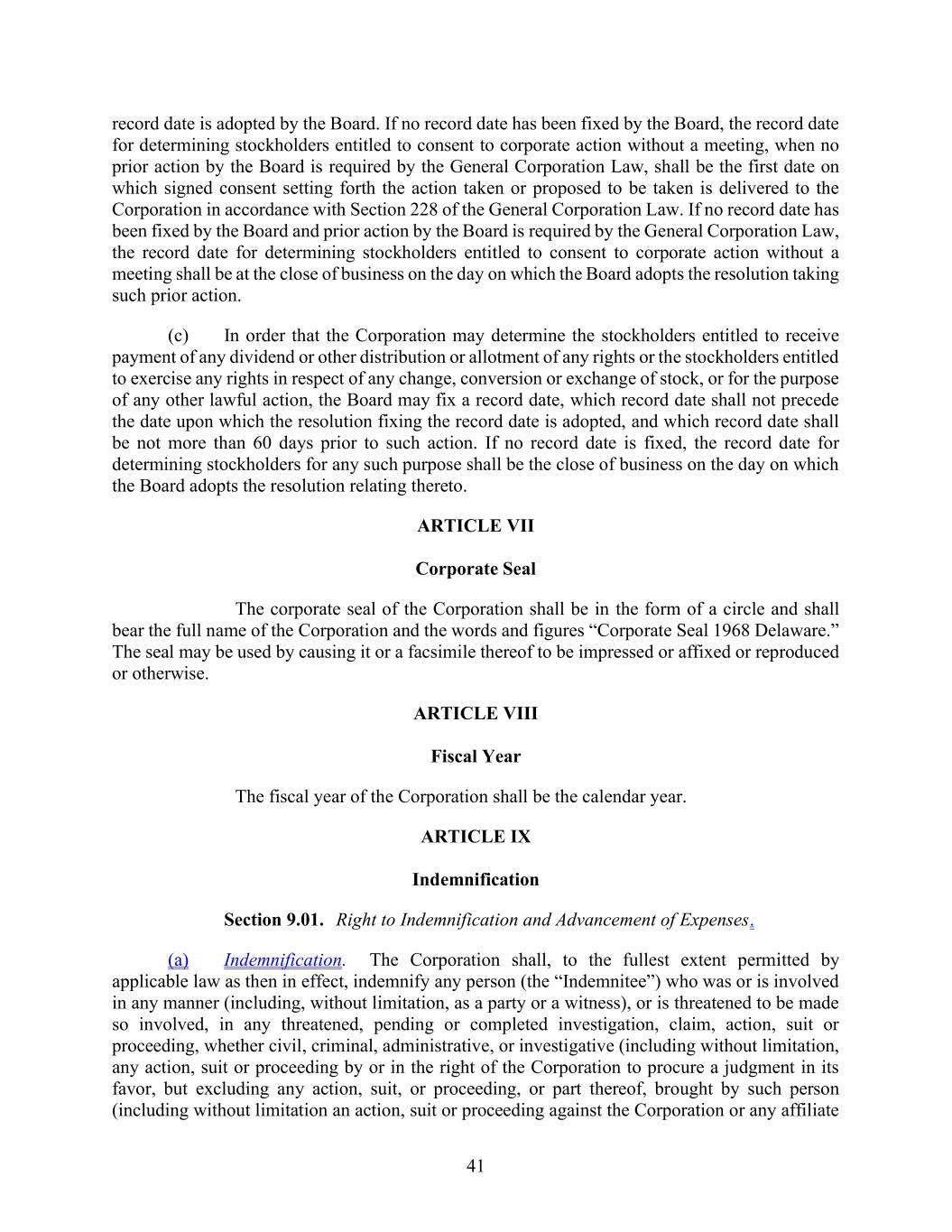 41 record date is adopted by the Board. If no record date has been fixed by the Board, the record date for determining stockholders entitled to consent to corporate action without a meeting, when no prior action by the Board is required by the General Corporation Law, shall be the first date on which signed consent setting forth the action taken or proposed to be taken is delivered to the Corporation in accordance with Section 228 of the General Corporation Law. If no record date has been fixed by the Board and prior action by the Board is required by the General Corporation Law, the record date for determining stockholders entitled to consent to corporate action without a meeting shall be at the close of business on the day on which the Board adopts the resolution taking such prior action. (c) In order that the Corporation may determine the stockholders entitled to receive payment of any dividend or other distribution or allotment of any rights or the stockholders entitled to exercise any rights in respect of any change, conversion or exchange of stock, or for the purpose of any other lawful action, the Board may fix a record date, which record date shall not precede the date upon which the resolution fixing the record date is adopted, and which record date shall be not more than 60 days prior to such action. If no record date is fixed, the record date for determining stockholders for any such purpose shall be the close of business on the day on which the Board adopts the resolution relating thereto. ARTICLE VII Corporate Seal The corporate seal of the Corporation shall be in the form of a circle and shall bear the full name of the Corporation and the words and figures “Corporate Seal 1968 Delaware.” The seal may be used by causing it or a facsimile thereof to be impressed or affixed or reproduced or otherwise. ARTICLE VIII Fiscal Year The fiscal year of the Corporation shall be the calendar year. ARTICLE IX Indemnification Section 9.01. Right to Indemnification and Advancement of Expenses. (a) Indemnification. The Corporation shall, to the fullest extent permitted by applicable law as then in effect, indemnify any person (the “Indemnitee”) who was or is involved in any manner (including, without limitation, as a party or a witness), or is threatened to be made so involved, in any threatened, pending or completed investigation, claim, action, suit or proceeding, whether civil, criminal, administrative, or investigative (including without limitation, any action, suit or proceeding by or in the right of the Corporation to procure a judgment in its favor, but excluding any action, suit, or proceeding, or part thereof, brought by such person (including without limitation an action, suit or proceeding against the Corporation or any affiliate