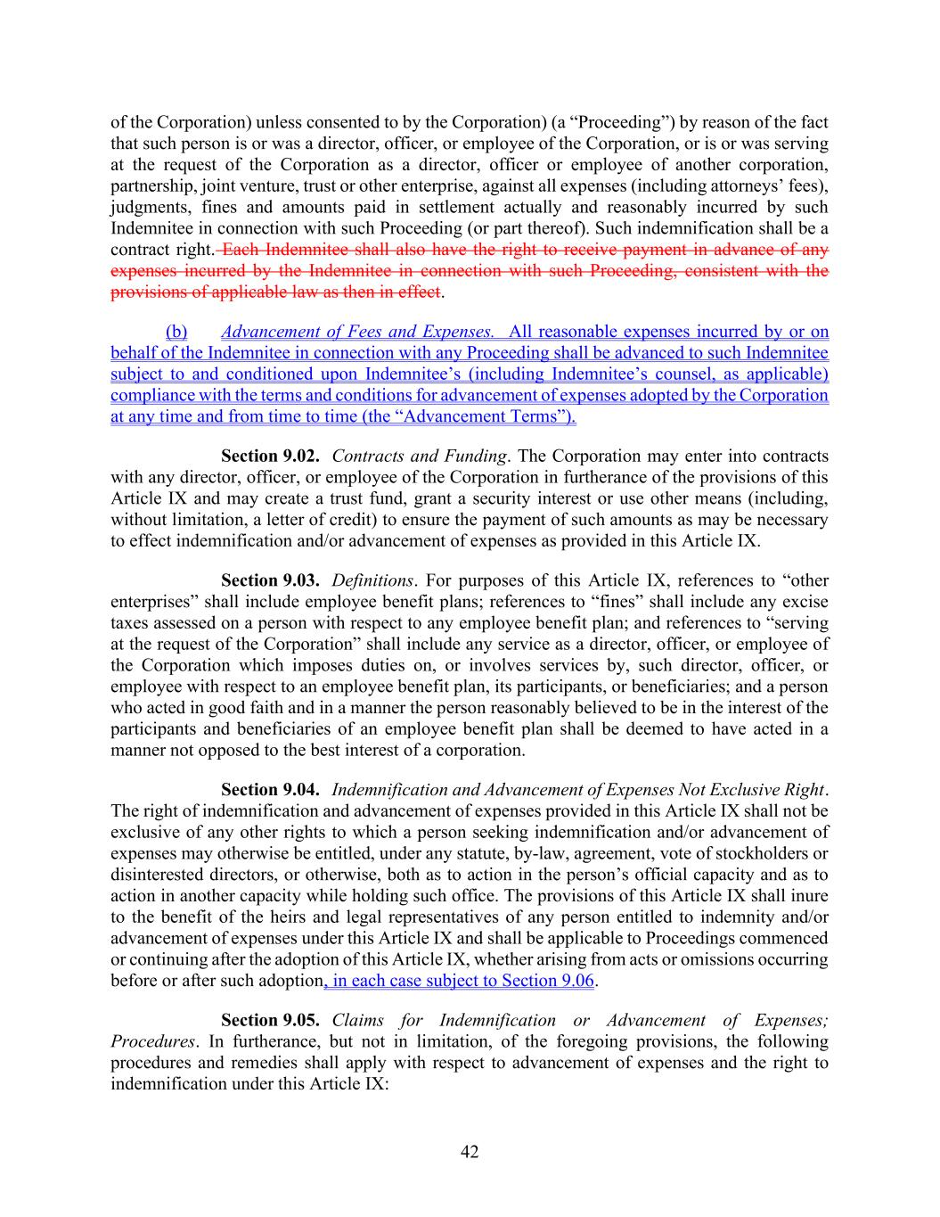 42 of the Corporation) unless consented to by the Corporation) (a “Proceeding”) by reason of the fact that such person is or was a director, officer, or employee of the Corporation, or is or was serving at the request of the Corporation as a director, officer or employee of another corporation, partnership, joint venture, trust or other enterprise, against all expenses (including attorneys’ fees), judgments, fines and amounts paid in settlement actually and reasonably incurred by such Indemnitee in connection with such Proceeding (or part thereof). Such indemnification shall be a contract right. Each Indemnitee shall also have the right to receive payment in advance of any expenses incurred by the Indemnitee in connection with such Proceeding, consistent with the provisions of applicable law as then in effect. (b) Advancement of Fees and Expenses. All reasonable expenses incurred by or on behalf of the Indemnitee in connection with any Proceeding shall be advanced to such Indemnitee subject to and conditioned upon Indemnitee’s (including Indemnitee’s counsel, as applicable) compliance with the terms and conditions for advancement of expenses adopted by the Corporation at any time and from time to time (the “Advancement Terms”). Section 9.02. Contracts and Funding. The Corporation may enter into contracts with any director, officer, or employee of the Corporation in furtherance of the provisions of this Article IX and may create a trust fund, grant a security interest or use other means (including, without limitation, a letter of credit) to ensure the payment of such amounts as may be necessary to effect indemnification and/or advancement of expenses as provided in this Article IX. Section 9.03. Definitions. For purposes of this Article IX, references to “other enterprises” shall include employee benefit plans; references to “fines” shall include any excise taxes assessed on a person with respect to any employee benefit plan; and references to “serving at the request of the Corporation” shall include any service as a director, officer, or employee of the Corporation which imposes duties on, or involves services by, such director, officer, or employee with respect to an employee benefit plan, its participants, or beneficiaries; and a person who acted in good faith and in a manner the person reasonably believed to be in the interest of the participants and beneficiaries of an employee benefit plan shall be deemed to have acted in a manner not opposed to the best interest of a corporation. Section 9.04. Indemnification and Advancement of Expenses Not Exclusive Right. The right of indemnification and advancement of expenses provided in this Article IX shall not be exclusive of any other rights to which a person seeking indemnification and/or advancement of expenses may otherwise be entitled, under any statute, by-law, agreement, vote of stockholders or disinterested directors, or otherwise, both as to action in the person’s official capacity and as to action in another capacity while holding such office. The provisions of this Article IX shall inure to the benefit of the heirs and legal representatives of any person entitled to indemnity and/or advancement of expenses under this Article IX and shall be applicable to Proceedings commenced or continuing after the adoption of this Article IX, whether arising from acts or omissions occurring before or after such adoption, in each case subject to Section 9.06. Section 9.05. Claims for Indemnification or Advancement of Expenses; Procedures. In furtherance, but not in limitation, of the foregoing provisions, the following procedures and remedies shall apply with respect to advancement of expenses and the right to indemnification under this Article IX: