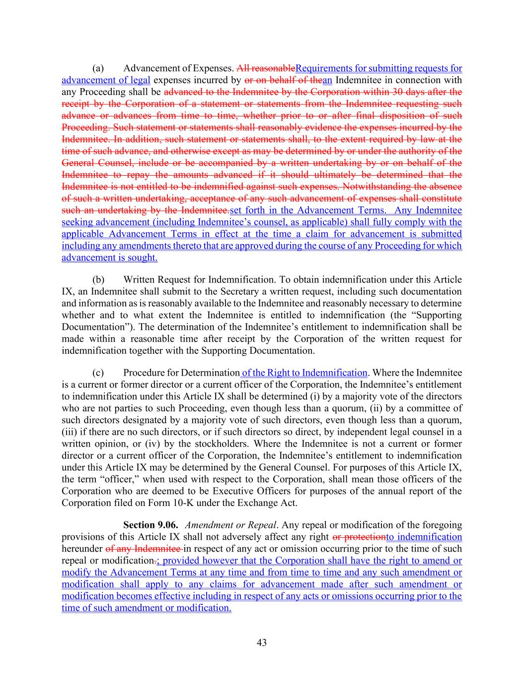 43 (a) Advancement of Expenses. All reasonableRequirements for submitting requests for advancement of legal expenses incurred by or on behalf of thean Indemnitee in connection with any Proceeding shall be advanced to the Indemnitee by the Corporation within 30 days after the receipt by the Corporation of a statement or statements from the Indemnitee requesting such advance or advances from time to time, whether prior to or after final disposition of such Proceeding. Such statement or statements shall reasonably evidence the expenses incurred by the Indemnitee. In addition, such statement or statements shall, to the extent required by law at the time of such advance, and otherwise except as may be determined by or under the authority of the General Counsel, include or be accompanied by a written undertaking by or on behalf of the Indemnitee to repay the amounts advanced if it should ultimately be determined that the Indemnitee is not entitled to be indemnified against such expenses. Notwithstanding the absence of such a written undertaking, acceptance of any such advancement of expenses shall constitute such an undertaking by the Indemnitee.set forth in the Advancement Terms. Any Indemnitee seeking advancement (including Indemnitee’s counsel, as applicable) shall fully comply with the applicable Advancement Terms in effect at the time a claim for advancement is submitted including any amendments thereto that are approved during the course of any Proceeding for which advancement is sought. (b) Written Request for Indemnification. To obtain indemnification under this Article IX, an Indemnitee shall submit to the Secretary a written request, including such documentation and information as is reasonably available to the Indemnitee and reasonably necessary to determine whether and to what extent the Indemnitee is entitled to indemnification (the “Supporting Documentation”). The determination of the Indemnitee’s entitlement to indemnification shall be made within a reasonable time after receipt by the Corporation of the written request for indemnification together with the Supporting Documentation. (c) Procedure for Determination of the Right to Indemnification. Where the Indemnitee is a current or former director or a current officer of the Corporation, the Indemnitee’s entitlement to indemnification under this Article IX shall be determined (i) by a majority vote of the directors who are not parties to such Proceeding, even though less than a quorum, (ii) by a committee of such directors designated by a majority vote of such directors, even though less than a quorum, (iii) if there are no such directors, or if such directors so direct, by independent legal counsel in a written opinion, or (iv) by the stockholders. Where the Indemnitee is not a current or former director or a current officer of the Corporation, the Indemnitee’s entitlement to indemnification under this Article IX may be determined by the General Counsel. For purposes of this Article IX, the term “officer,” when used with respect to the Corporation, shall mean those officers of the Corporation who are deemed to be Executive Officers for purposes of the annual report of the Corporation filed on Form 10-K under the Exchange Act. Section 9.06. Amendment or Repeal. Any repeal or modification of the foregoing provisions of this Article IX shall not adversely affect any right or protectionto indemnification hereunder of any Indemnitee in respect of any act or omission occurring prior to the time of such repeal or modification.; provided however that the Corporation shall have the right to amend or modify the Advancement Terms at any time and from time to time and any such amendment or modification shall apply to any claims for advancement made after such amendment or modification becomes effective including in respect of any acts or omissions occurring prior to the time of such amendment or modification.