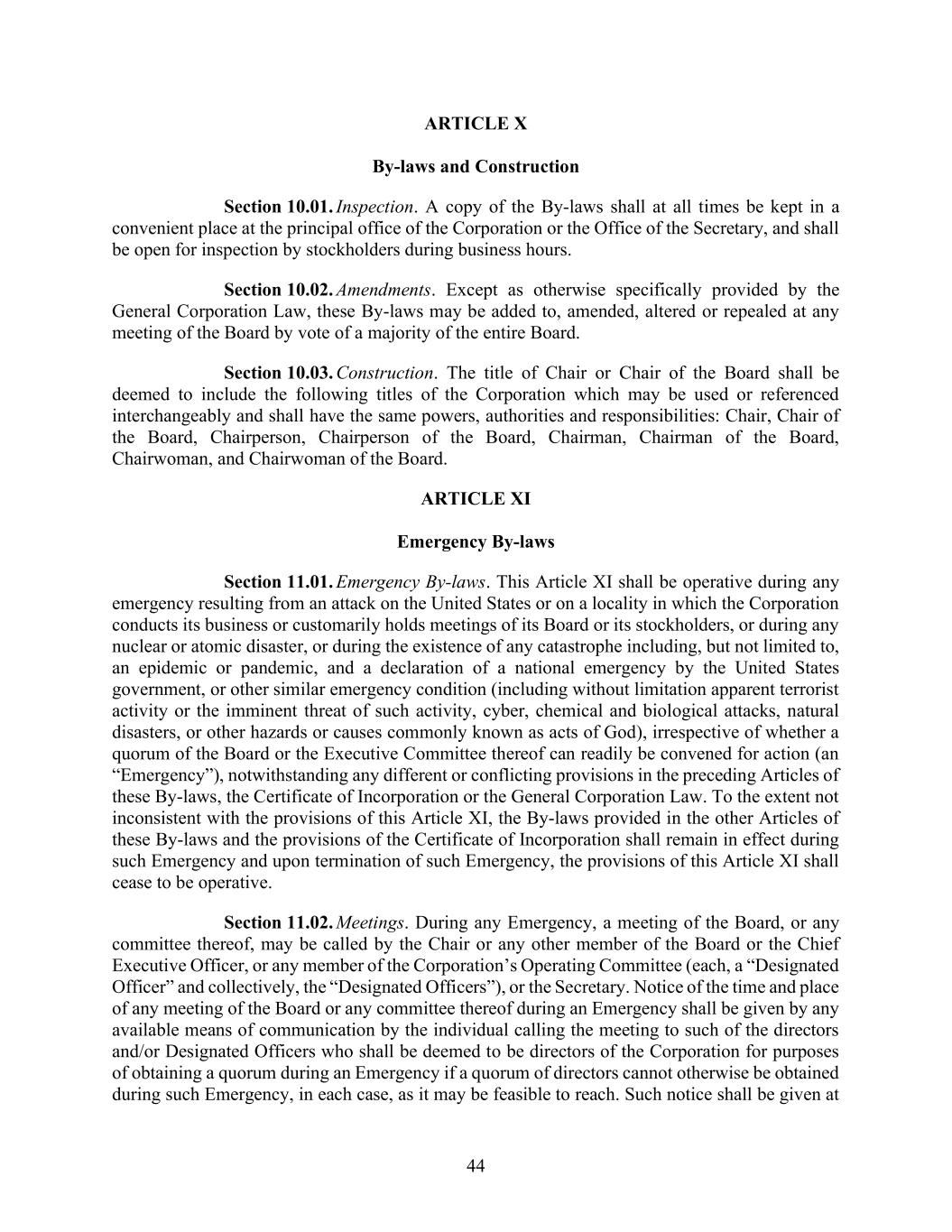 44 ARTICLE X By-laws and Construction Section 10.01. Inspection. A copy of the By-laws shall at all times be kept in a convenient place at the principal office of the Corporation or the Office of the Secretary, and shall be open for inspection by stockholders during business hours. Section 10.02. Amendments. Except as otherwise specifically provided by the General Corporation Law, these By-laws may be added to, amended, altered or repealed at any meeting of the Board by vote of a majority of the entire Board. Section 10.03. Construction. The title of Chair or Chair of the Board shall be deemed to include the following titles of the Corporation which may be used or referenced interchangeably and shall have the same powers, authorities and responsibilities: Chair, Chair of the Board, Chairperson, Chairperson of the Board, Chairman, Chairman of the Board, Chairwoman, and Chairwoman of the Board. ARTICLE XI Emergency By-laws Section 11.01. Emergency By-laws. This Article XI shall be operative during any emergency resulting from an attack on the United States or on a locality in which the Corporation conducts its business or customarily holds meetings of its Board or its stockholders, or during any nuclear or atomic disaster, or during the existence of any catastrophe including, but not limited to, an epidemic or pandemic, and a declaration of a national emergency by the United States government, or other similar emergency condition (including without limitation apparent terrorist activity or the imminent threat of such activity, cyber, chemical and biological attacks, natural disasters, or other hazards or causes commonly known as acts of God), irrespective of whether a quorum of the Board or the Executive Committee thereof can readily be convened for action (an “Emergency”), notwithstanding any different or conflicting provisions in the preceding Articles of these By-laws, the Certificate of Incorporation or the General Corporation Law. To the extent not inconsistent with the provisions of this Article XI, the By-laws provided in the other Articles of these By-laws and the provisions of the Certificate of Incorporation shall remain in effect during such Emergency and upon termination of such Emergency, the provisions of this Article XI shall cease to be operative. Section 11.02. Meetings. During any Emergency, a meeting of the Board, or any committee thereof, may be called by the Chair or any other member of the Board or the Chief Executive Officer, or any member of the Corporation’s Operating Committee (each, a “Designated Officer” and collectively, the “Designated Officers”), or the Secretary. Notice of the time and place of any meeting of the Board or any committee thereof during an Emergency shall be given by any available means of communication by the individual calling the meeting to such of the directors and/or Designated Officers who shall be deemed to be directors of the Corporation for purposes of obtaining a quorum during an Emergency if a quorum of directors cannot otherwise be obtained during such Emergency, in each case, as it may be feasible to reach. Such notice shall be given at
