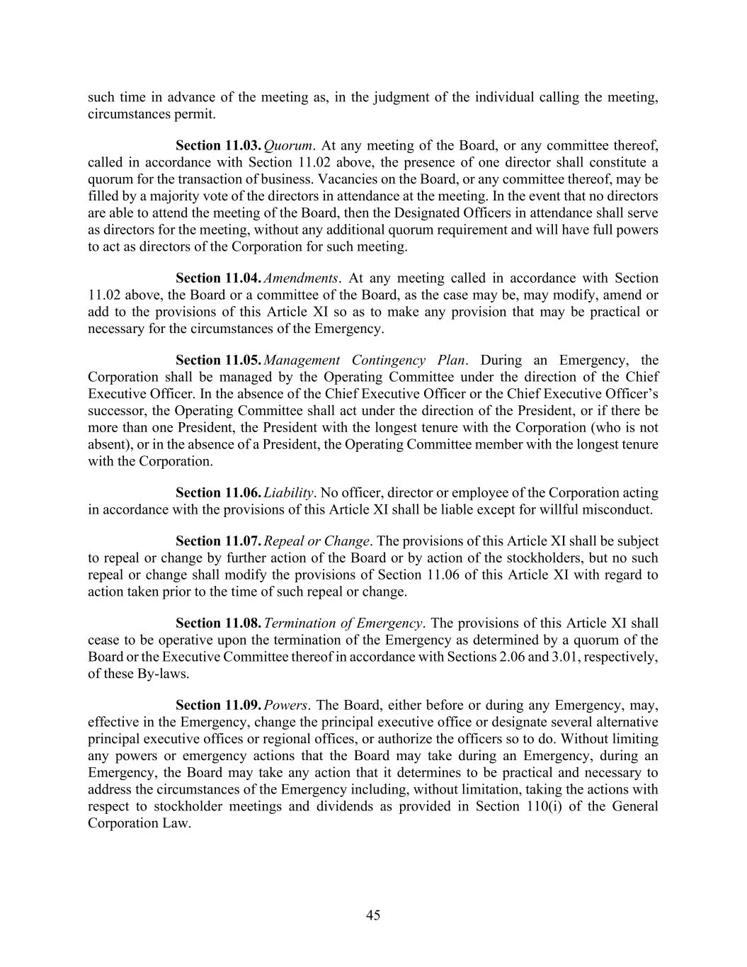 45 such time in advance of the meeting as, in the judgment of the individual calling the meeting, circumstances permit. Section 11.03. Quorum. At any meeting of the Board, or any committee thereof, called in accordance with Section 11.02 above, the presence of one director shall constitute a quorum for the transaction of business. Vacancies on the Board, or any committee thereof, may be filled by a majority vote of the directors in attendance at the meeting. In the event that no directors are able to attend the meeting of the Board, then the Designated Officers in attendance shall serve as directors for the meeting, without any additional quorum requirement and will have full powers to act as directors of the Corporation for such meeting. Section 11.04. Amendments. At any meeting called in accordance with Section 11.02 above, the Board or a committee of the Board, as the case may be, may modify, amend or add to the provisions of this Article XI so as to make any provision that may be practical or necessary for the circumstances of the Emergency. Section 11.05. Management Contingency Plan. During an Emergency, the Corporation shall be managed by the Operating Committee under the direction of the Chief Executive Officer. In the absence of the Chief Executive Officer or the Chief Executive Officer’s successor, the Operating Committee shall act under the direction of the President, or if there be more than one President, the President with the longest tenure with the Corporation (who is not absent), or in the absence of a President, the Operating Committee member with the longest tenure with the Corporation. Section 11.06. Liability. No officer, director or employee of the Corporation acting in accordance with the provisions of this Article XI shall be liable except for willful misconduct. Section 11.07. Repeal or Change. The provisions of this Article XI shall be subject to repeal or change by further action of the Board or by action of the stockholders, but no such repeal or change shall modify the provisions of Section 11.06 of this Article XI with regard to action taken prior to the time of such repeal or change. Section 11.08. Termination of Emergency. The provisions of this Article XI shall cease to be operative upon the termination of the Emergency as determined by a quorum of the Board or the Executive Committee thereof in accordance with Sections 2.06 and 3.01, respectively, of these By-laws. Section 11.09. Powers. The Board, either before or during any Emergency, may, effective in the Emergency, change the principal executive office or designate several alternative principal executive offices or regional offices, or authorize the officers so to do. Without limiting any powers or emergency actions that the Board may take during an Emergency, during an Emergency, the Board may take any action that it determines to be practical and necessary to address the circumstances of the Emergency including, without limitation, taking the actions with respect to stockholder meetings and dividends as provided in Section 110(i) of the General Corporation Law.