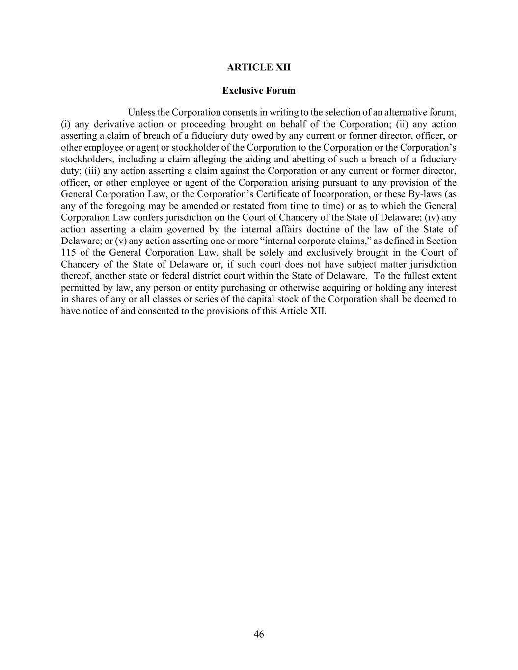 46 ARTICLE XII Exclusive Forum Unless the Corporation consents in writing to the selection of an alternative forum, (i) any derivative action or proceeding brought on behalf of the Corporation; (ii) any action asserting a claim of breach of a fiduciary duty owed by any current or former director, officer, or other employee or agent or stockholder of the Corporation to the Corporation or the Corporation’s stockholders, including a claim alleging the aiding and abetting of such a breach of a fiduciary duty; (iii) any action asserting a claim against the Corporation or any current or former director, officer, or other employee or agent of the Corporation arising pursuant to any provision of the General Corporation Law, or the Corporation’s Certificate of Incorporation, or these By-laws (as any of the foregoing may be amended or restated from time to time) or as to which the General Corporation Law confers jurisdiction on the Court of Chancery of the State of Delaware; (iv) any action asserting a claim governed by the internal affairs doctrine of the law of the State of Delaware; or (v) any action asserting one or more “internal corporate claims,” as defined in Section 115 of the General Corporation Law, shall be solely and exclusively brought in the Court of Chancery of the State of Delaware or, if such court does not have subject matter jurisdiction thereof, another state or federal district court within the State of Delaware. To the fullest extent permitted by law, any person or entity purchasing or otherwise acquiring or holding any interest in shares of any or all classes or series of the capital stock of the Corporation shall be deemed to have notice of and consented to the provisions of this Article XII.
